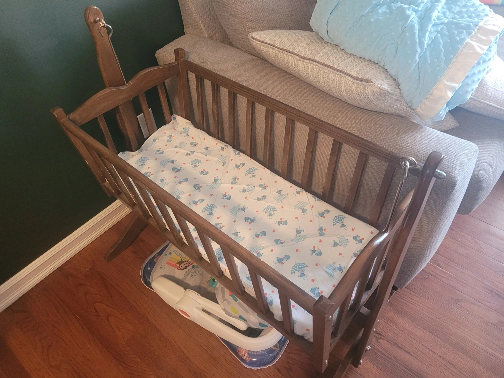Gently used wooden baby cradle in great condition! Perfect for newborns and infants. Comes with a mattress pad. It's a lovely addition to any nursery.