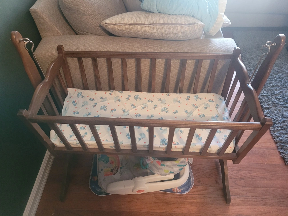 Gently used wooden baby cradle in great condition! Perfect for newborns and infants. Comes with a mattress pad. It's a lovely addition to any nursery.