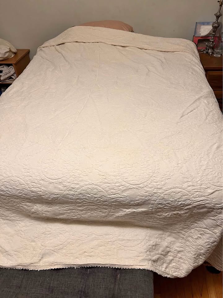 Beautiful vintage ivory cotton matelassé bedspread, made in the USA and consistent with the weaving and finishing style of Bates Mill (Lewiston, Maine) — known for their heirloom-quality cotton spreads. Labeled as Full size, but modeled on a queen bed.