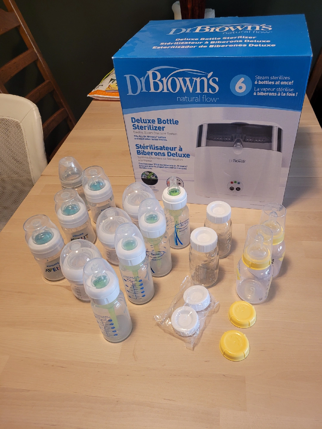 Selling a Dr. Brown's Deluxe Bottle Sterilizer. It steam sterilizes 6 bottles at once! Includes a variety of bottles from Dr. Brown's, Philips Avent, and others. Perfect for new parents!