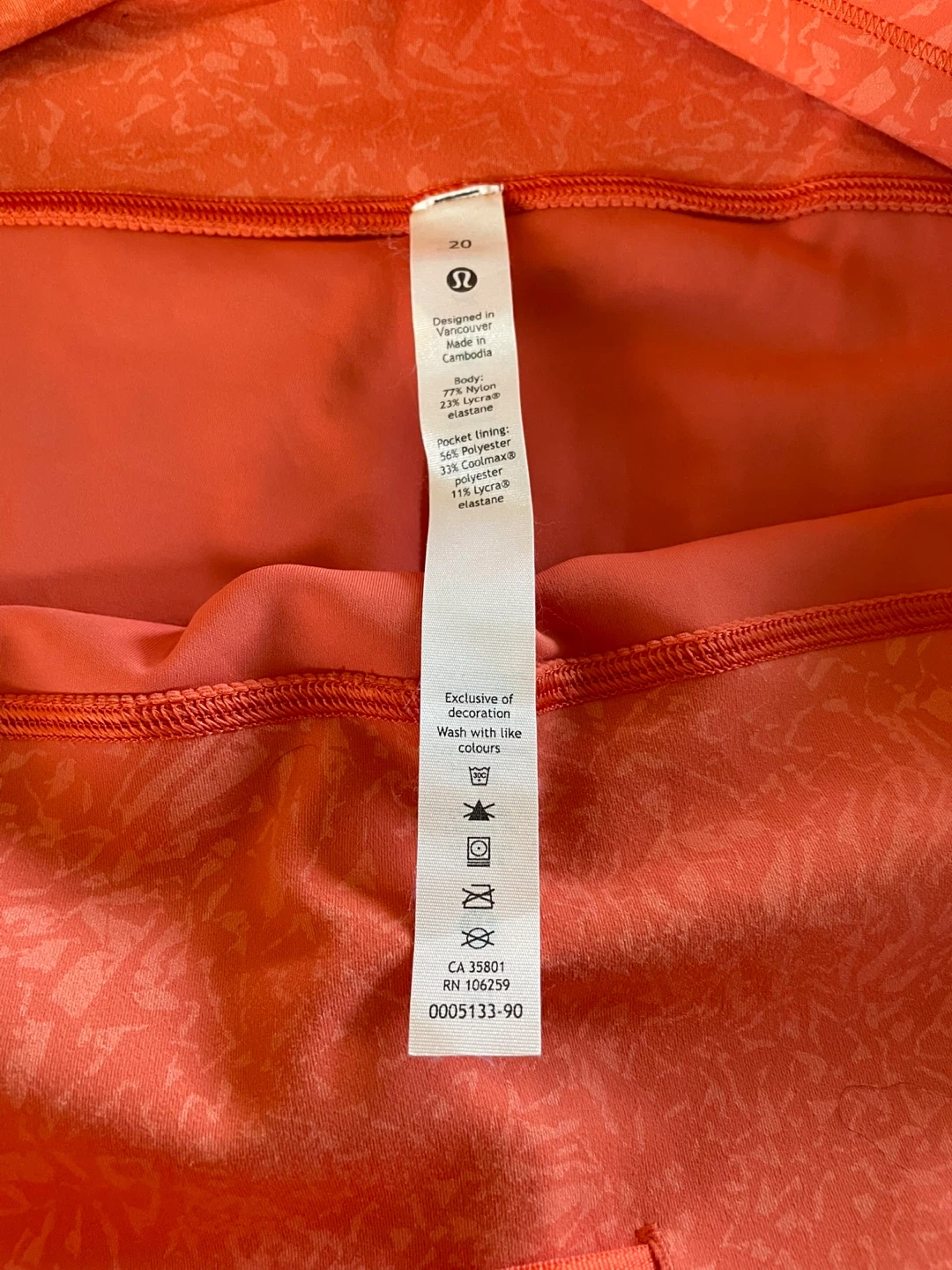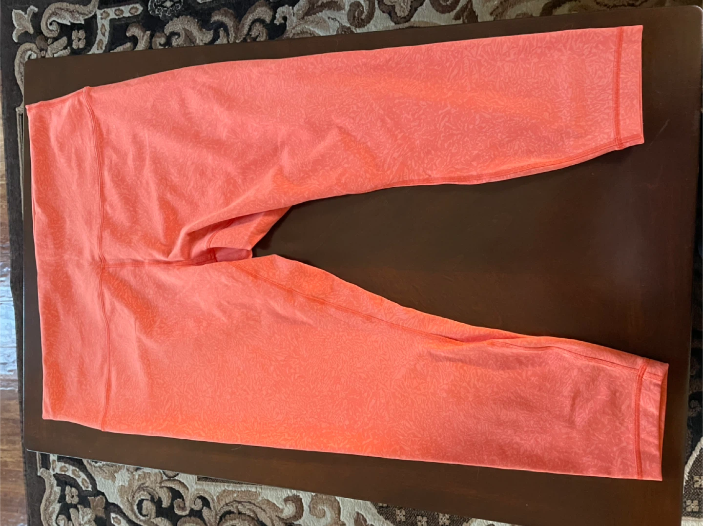 Selling a pair of Lululemon Align Crop leggings in a size 20. They're a beautiful coral colour and made with 77% nylon and 23% elastane. Perfect for yoga or everyday wear!