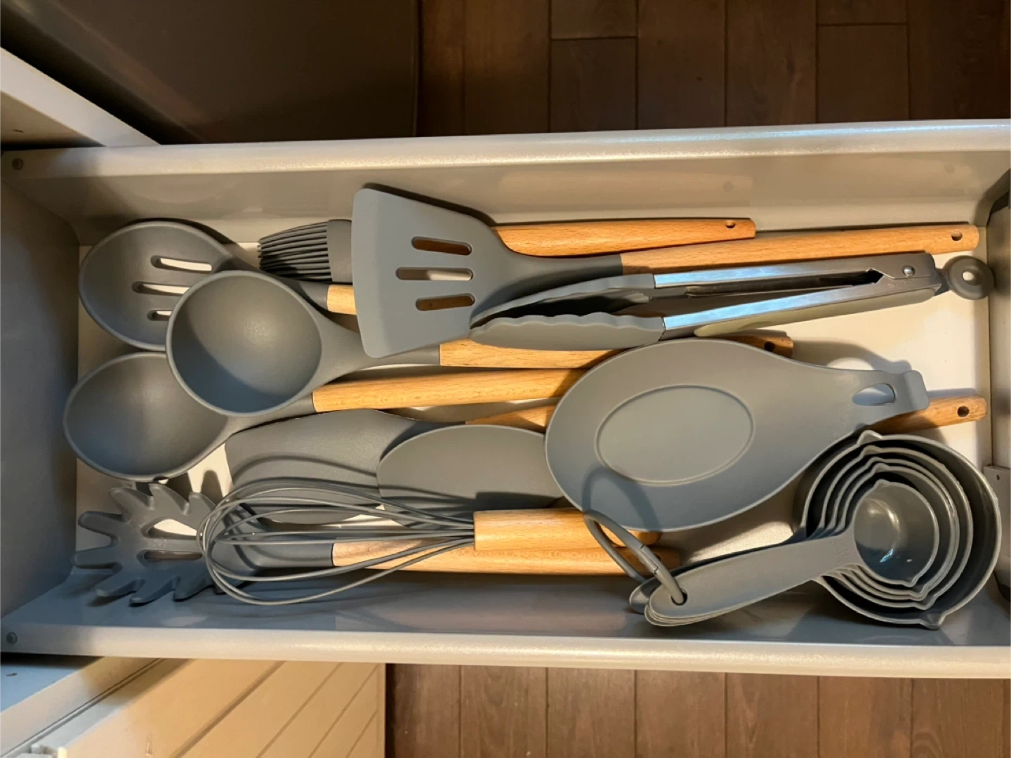 Selling a grey silicone kitchen utensil set! It includes a variety of essential cooking tools such as spoons, spatulas, tongs, a whisk, and measuring cups. Perfect for any kitchen!
