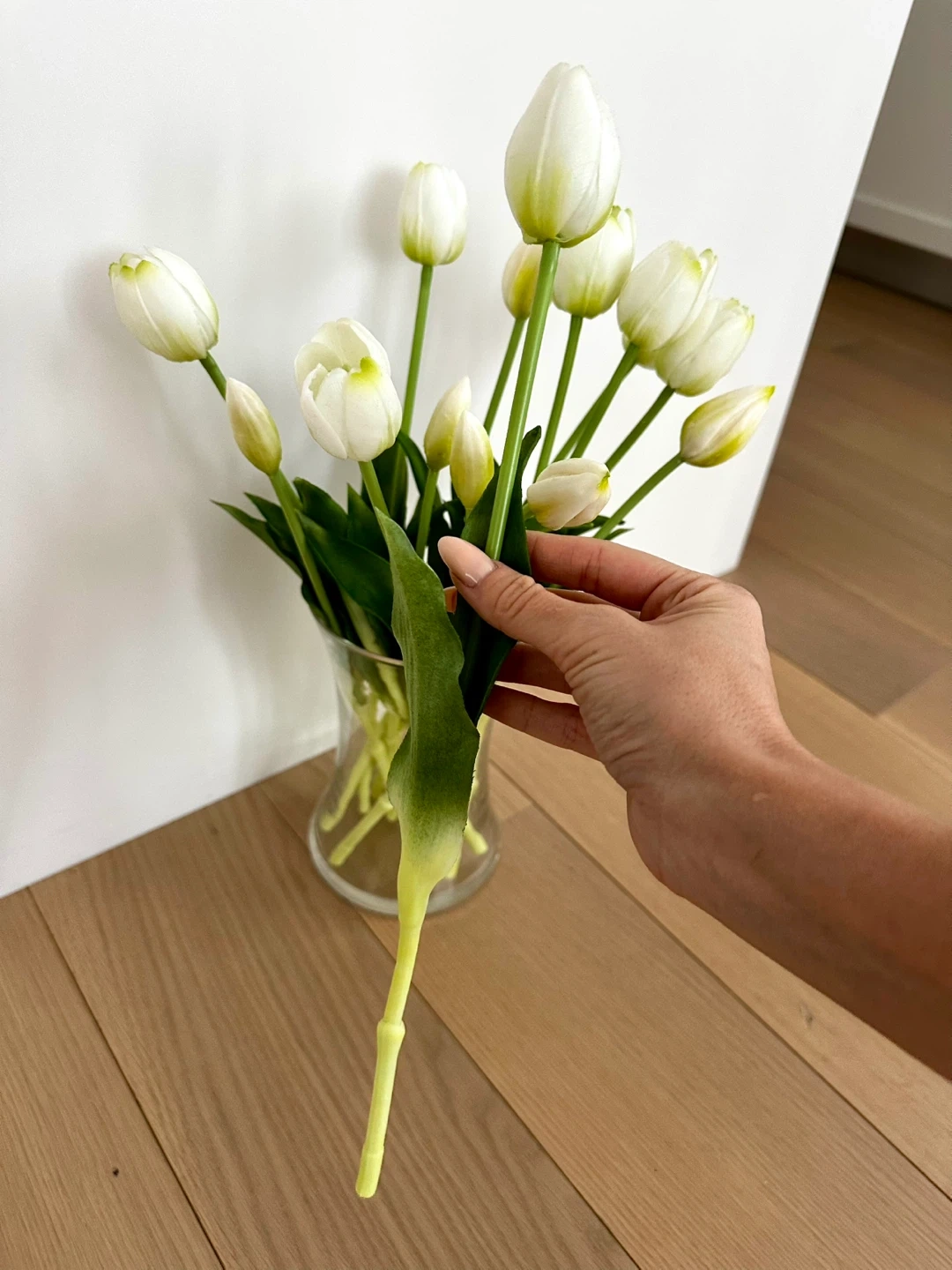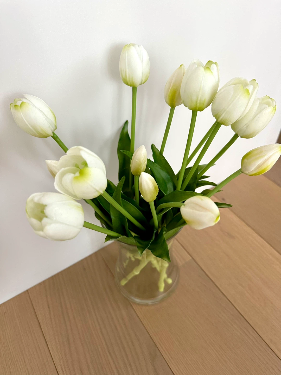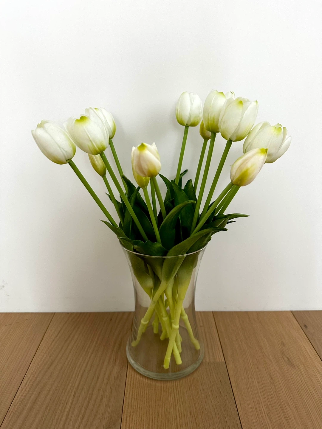 Selling a lovely faux floral arrangement featuring white tulips (variety up to 15”) in a clear glass vase (8”). Perfect decoration to any room in excellent conditions