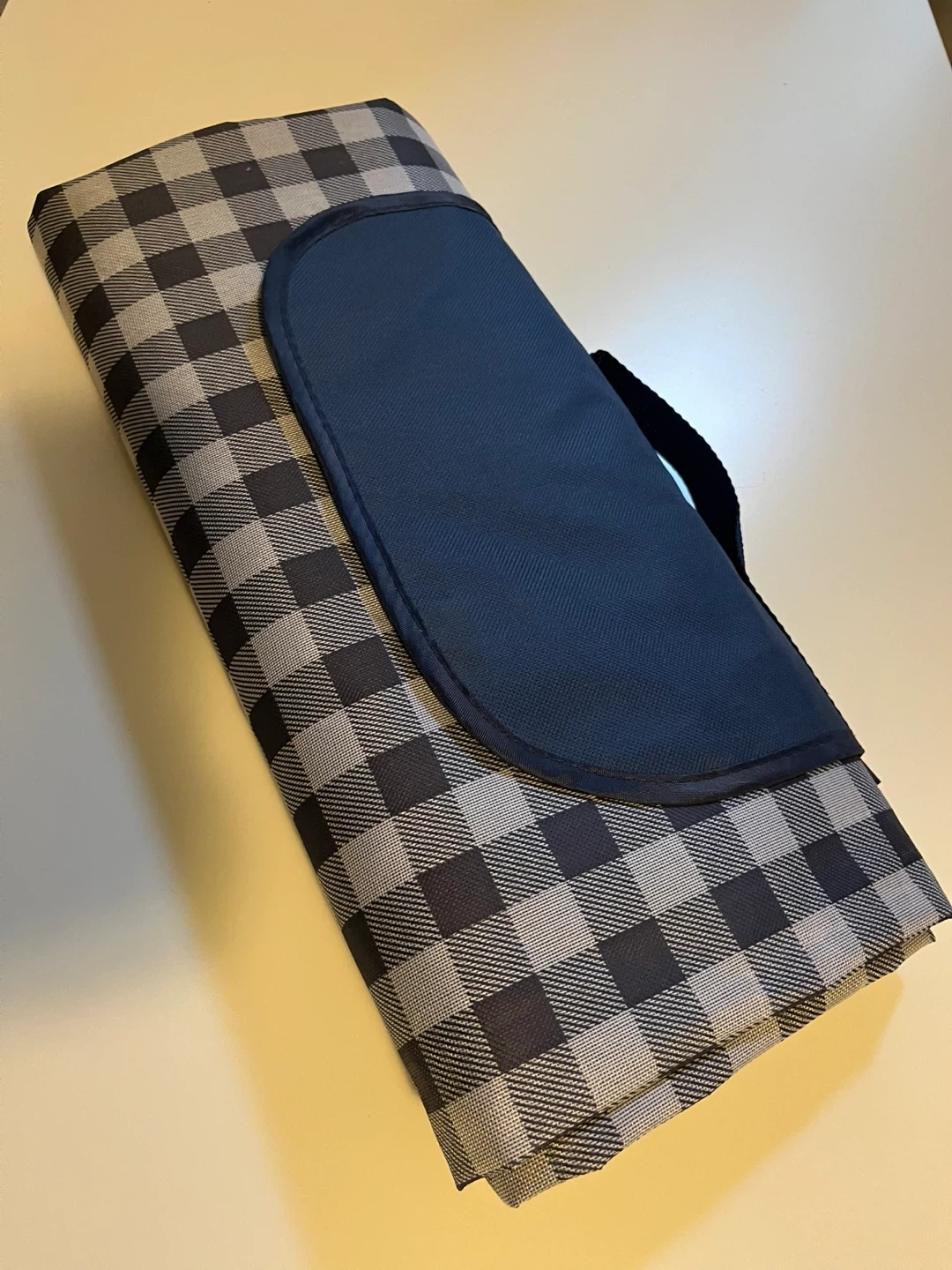 Picnic blanket with a gingham pattern in navy blue! It rolls up easily and has a convenient carrying handle for easy transport to the park or beach