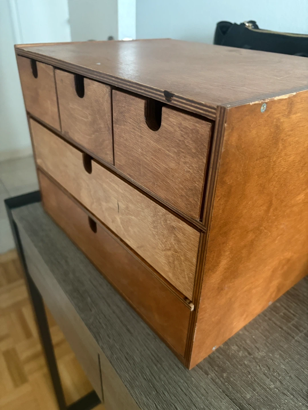 Selling a wooden drawer storage unit. It has a few scratches but is still in good condition and perfect for organizing your space