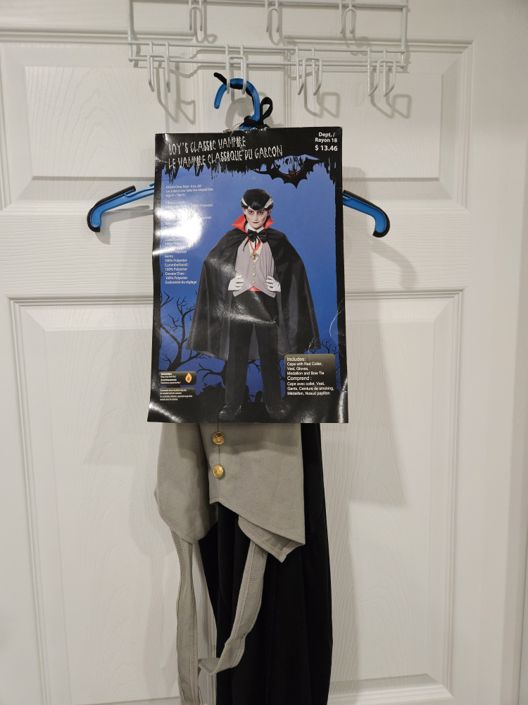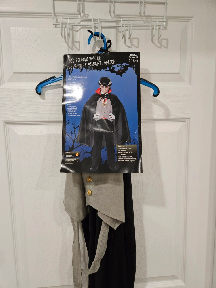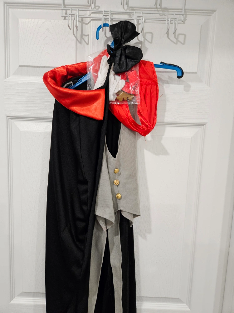 Selling a boy's classic vampire costume! It includes a cape, vest, pants, and accessories like a jabot collar and medallion with bow tie. Perfect for Halloween or dress-up!