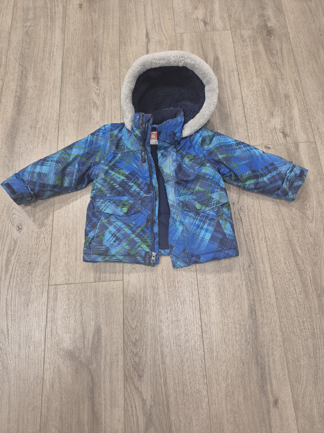 Cozy Krickets winter jacket for kids! This jacket is in great condition and perfect for keeping your little one warm during the colder months. It features a hood and a fun blue and green plaid pattern. Size is 3T.