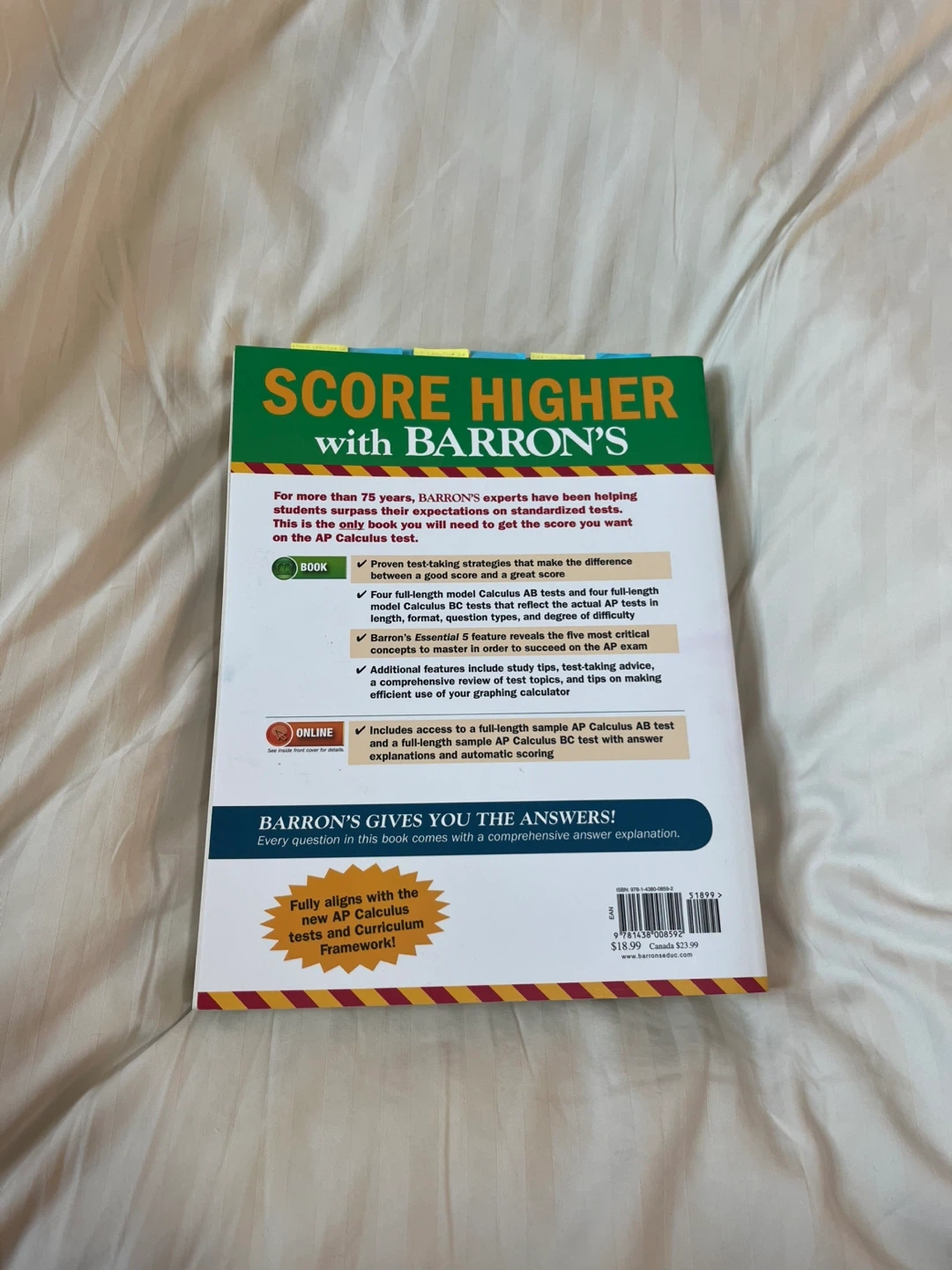 Selling Barron's AP Calculus, 14th Edition. This book is great for AP review and practice tests. It includes access to a full-length sample AP Calculus AB test and a full-length sample AP Calculus BC test with answer explanations and automatic scoring.