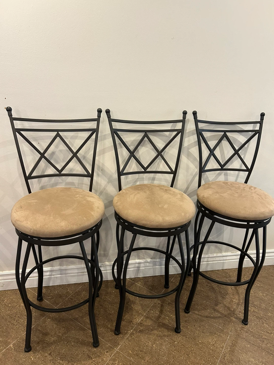 Selling a set of three swivel bar stools! They have a wrought iron style frame and a tan coloured seat. They are in good condition and would look great in any kitchen or bar area.