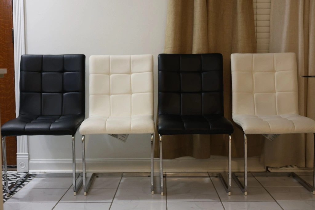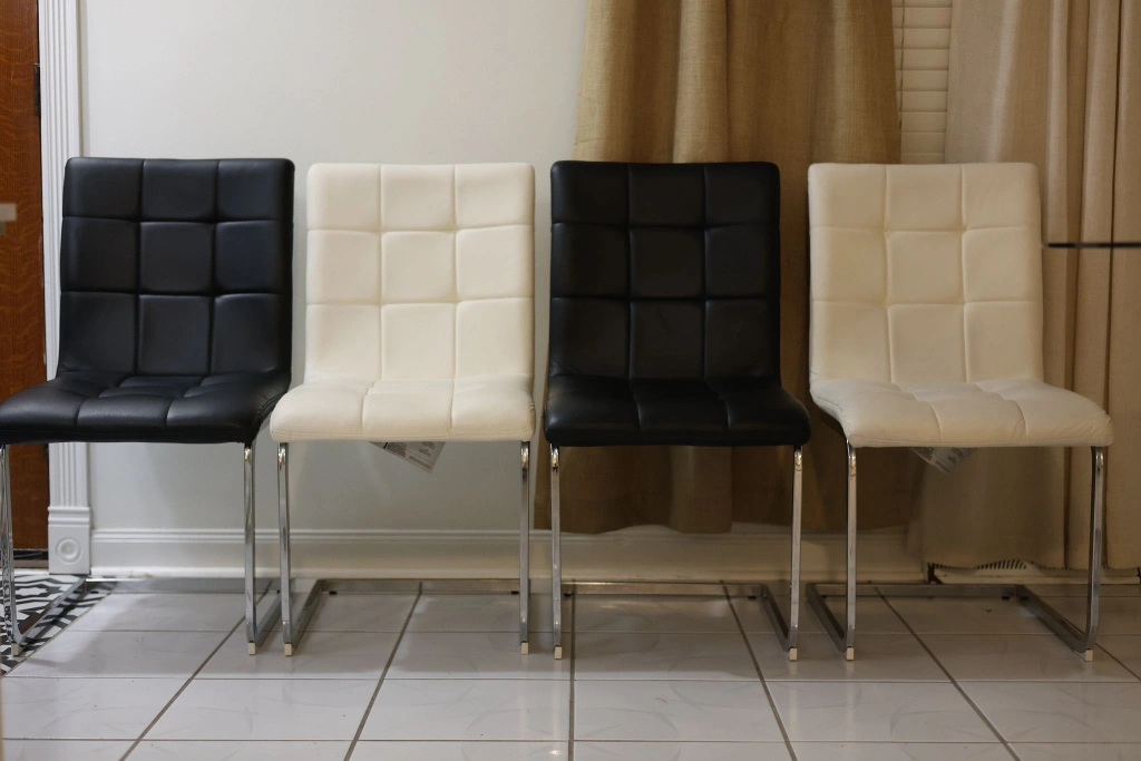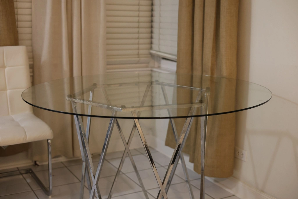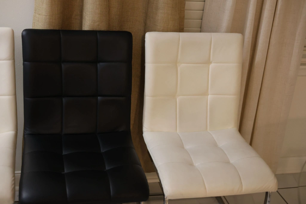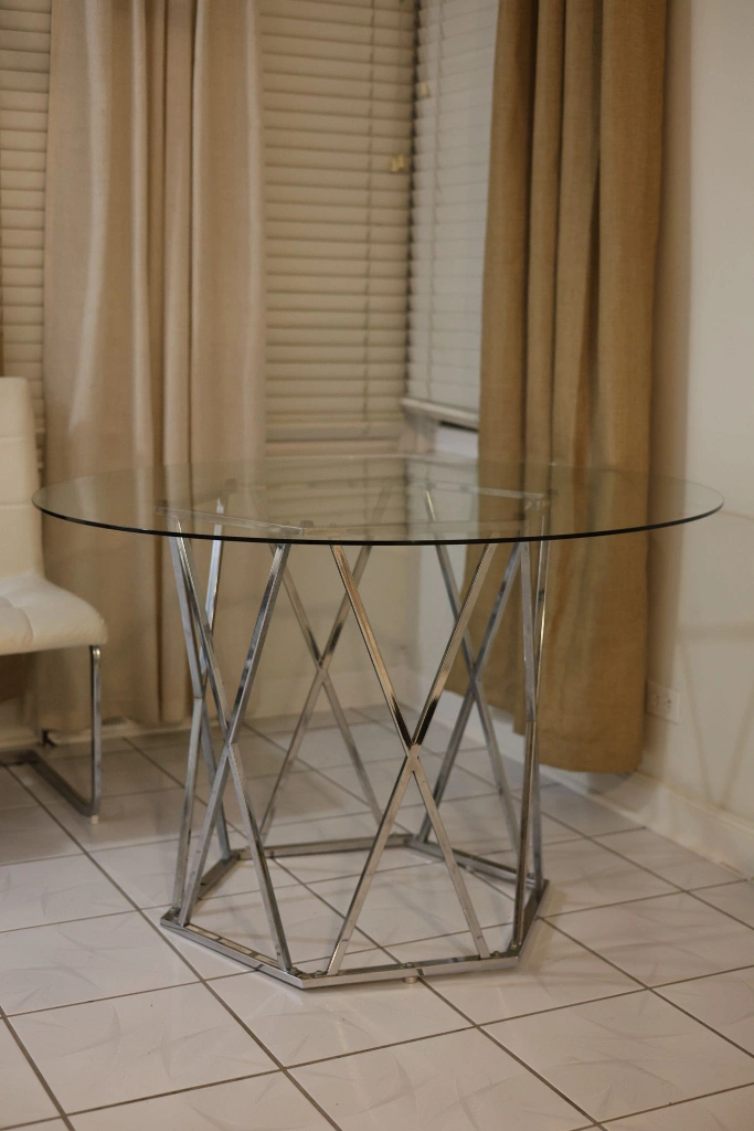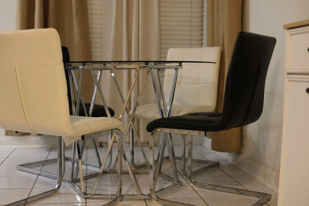 Selling a glass top dining table with four chairs. The chairs are a mix of black and white, with a modern, grid-patterned design. The table has a unique, geometric chrome base that adds a touch of elegance to any dining space