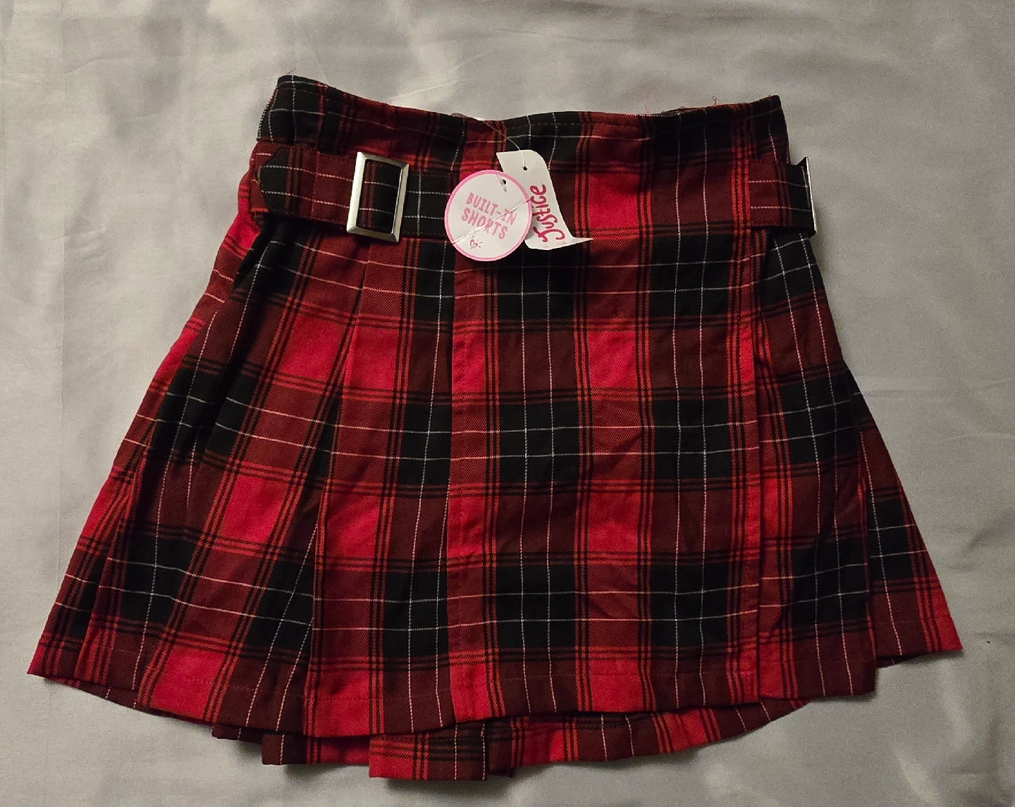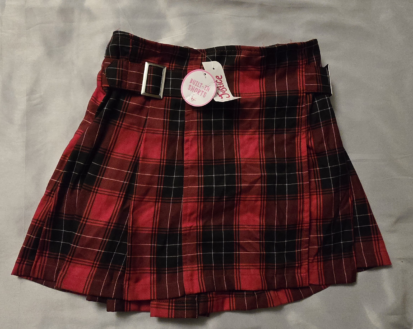 This Justice skort is brand new with tags and features a classic red plaid pattern. It has built-in shorts for comfort and coverage, and a stylish belt detail. The size is 12, and the length is about 13 inches. Perfect for Christmas or any occasion!
