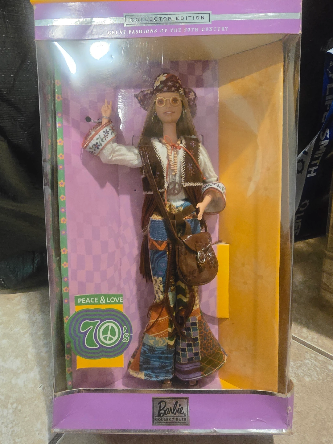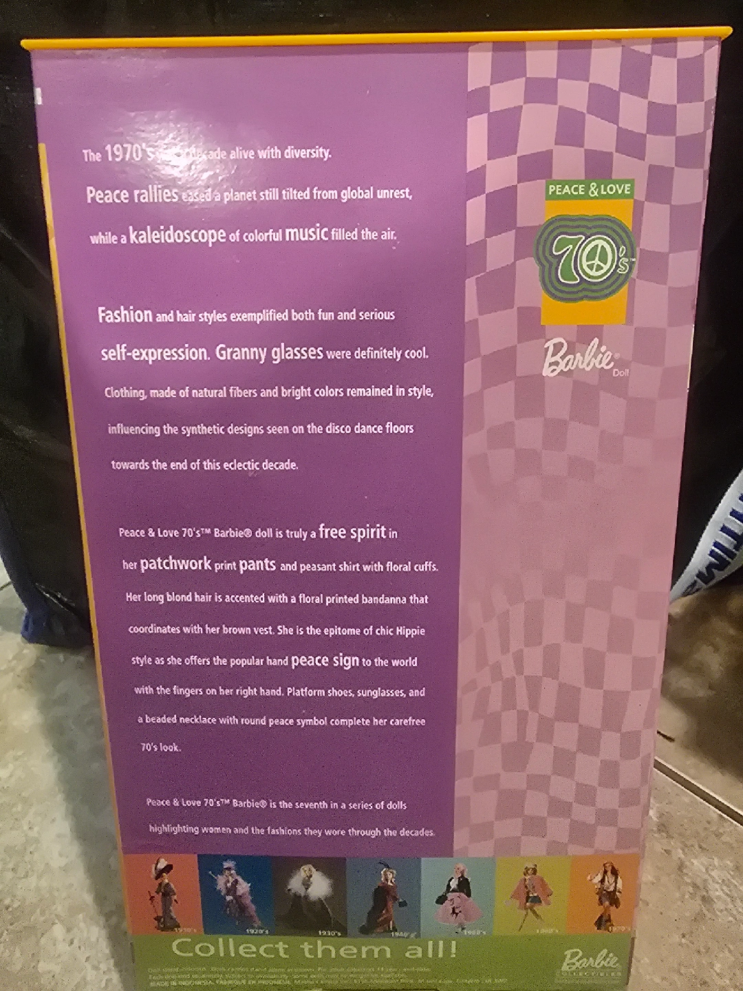 Selling a Barbie Peace & Love 70's Doll from the Collector Edition series. This doll features a free spirit in her patchwork print pants and peasant shirt with floral cuffs. Her long blond hair is accented with a floral printed bandana. She offers the popular peace sign to the world with her fingers on her right hand. Platform shoes, sunglasses, and a beaded necklace with round peace symbol complete her carefree 70's look. The 70's Barbie is the seventh in a series of dolls highlighting women and the fashions they wore through the decades.box has wear