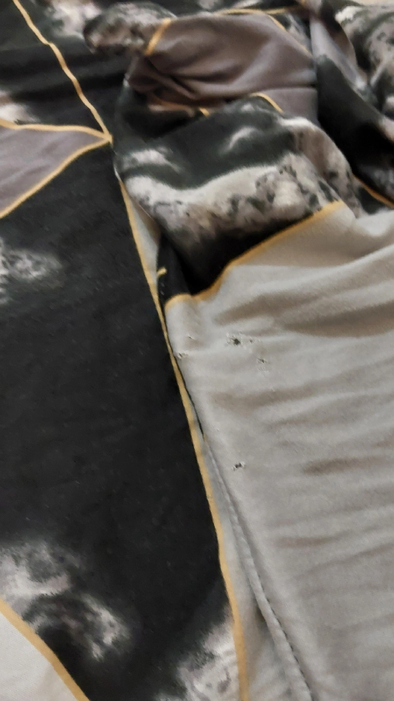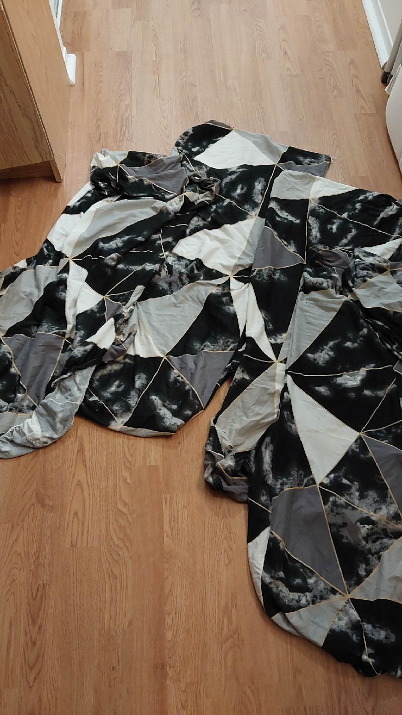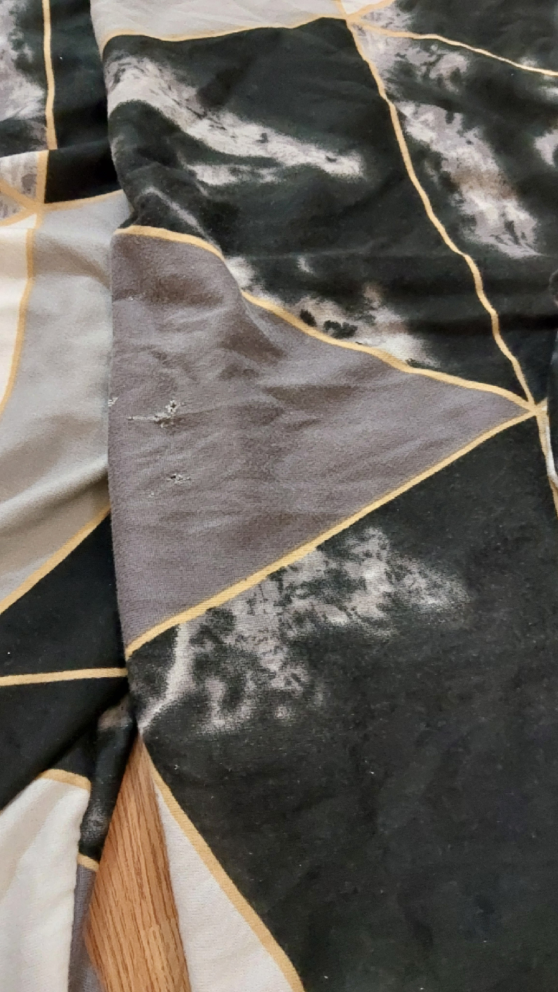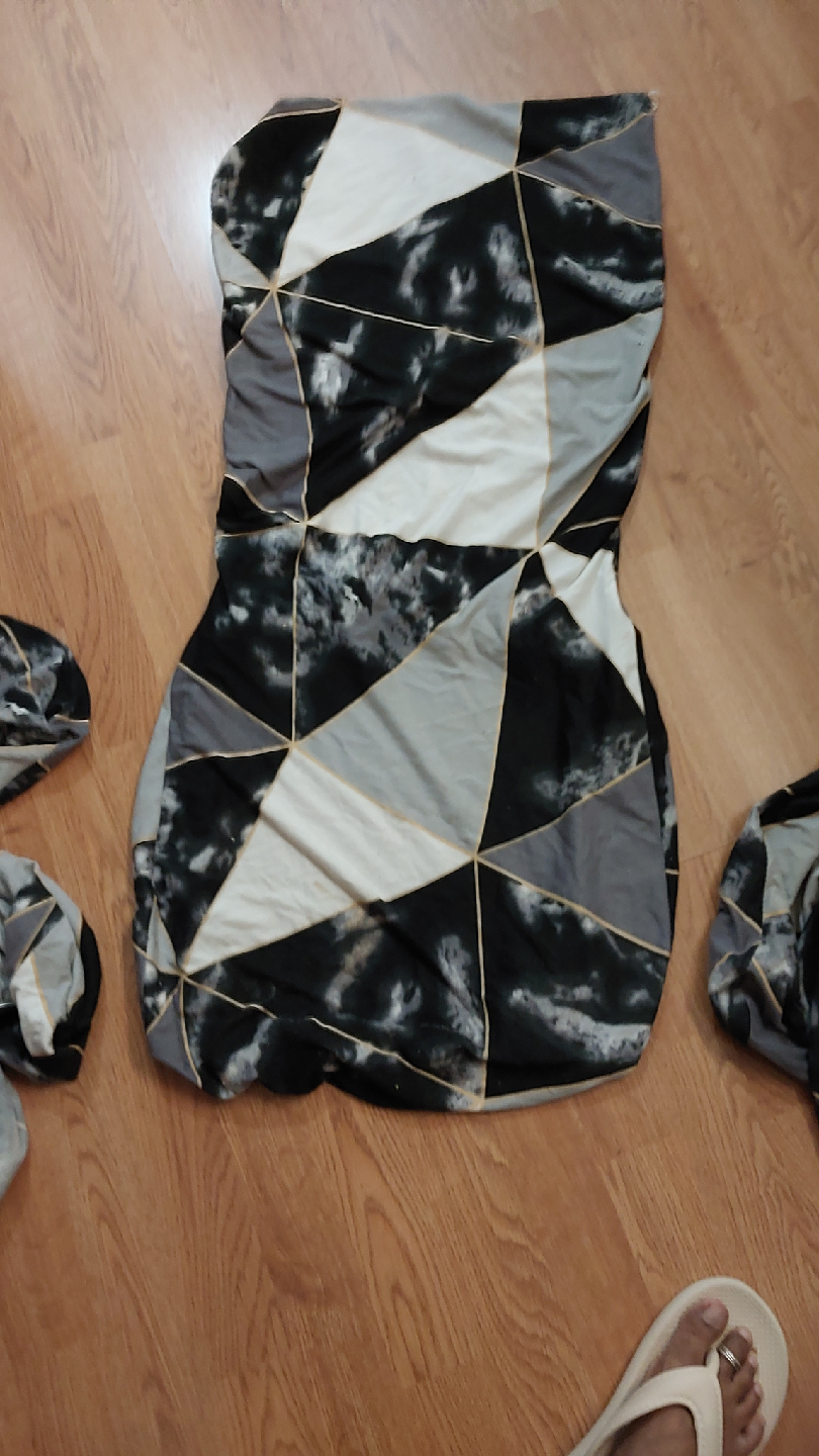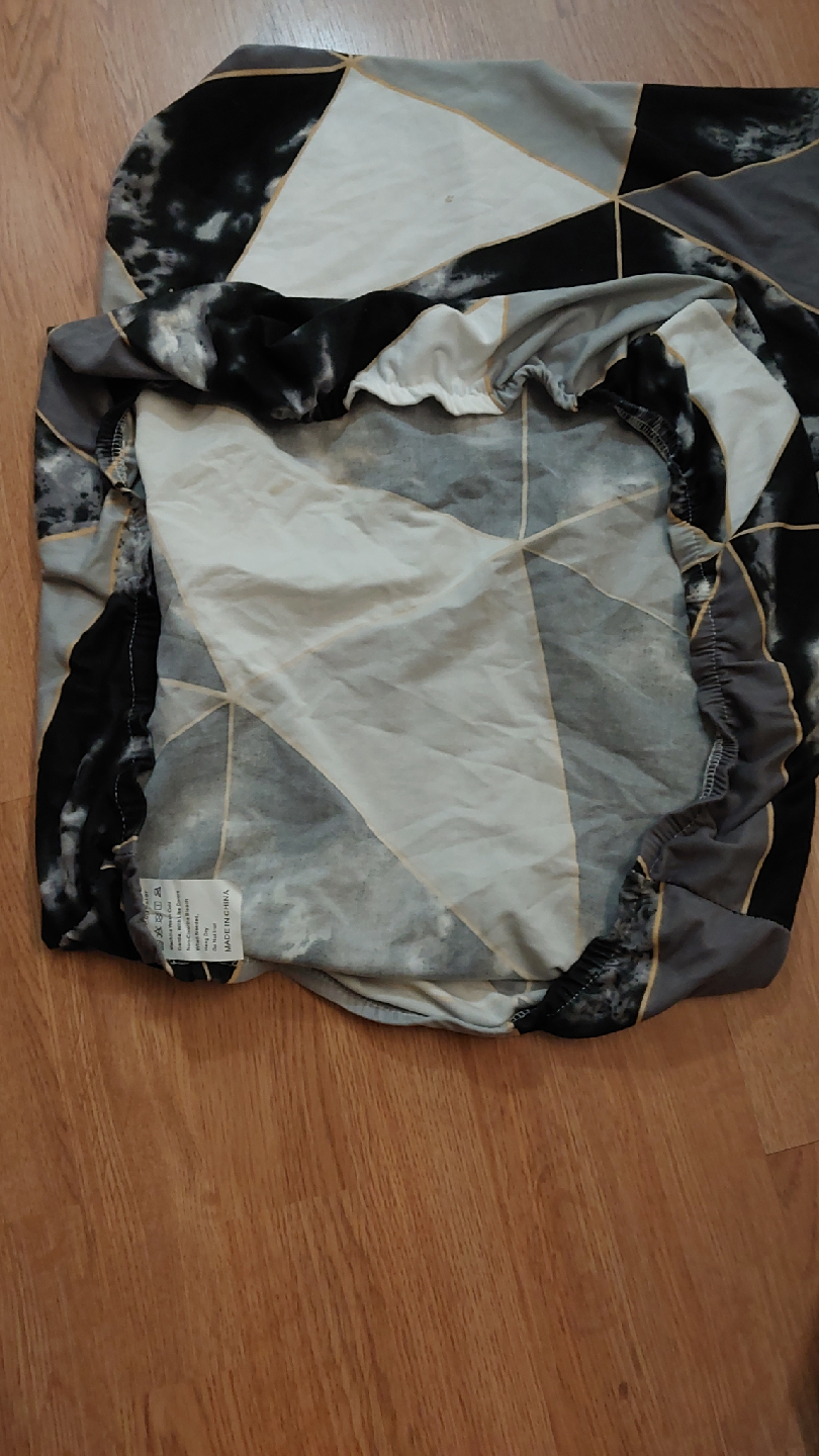 Chair cover with a geometric pattern in black, white, and grey. It shows some signs of wear, as seen in the photos.