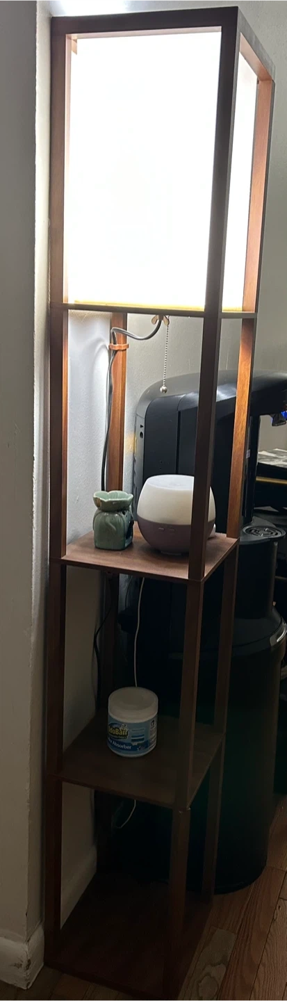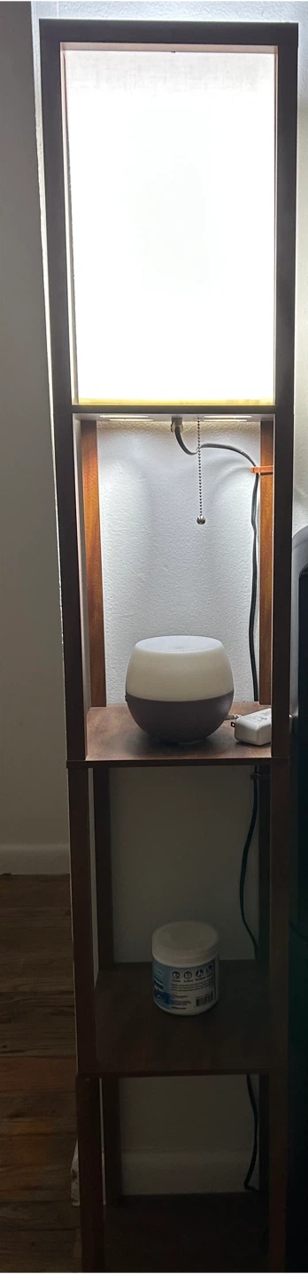 I'm selling a Brightech Maxwell Shelf Floor Lamp! It's a stylish and functional addition to any room. The lamp features built-in shelves for displaying your favorite items or keeping essentials within reach. It provides a warm and inviting light, perfect for creating a cozy atmosphere in your home