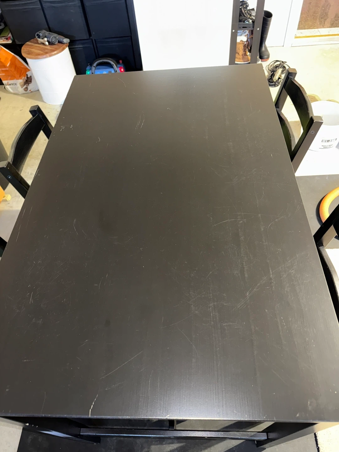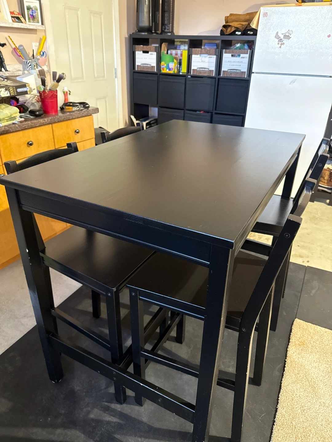 Selling a black dining table that comes with four chairs. It's a great set for a smaller dining space or kitchen nook. The table and chairs are in used condition with some visible wear and scratches, but still have lots of life left in them! Perfect for a starter set or a budget-friendly option