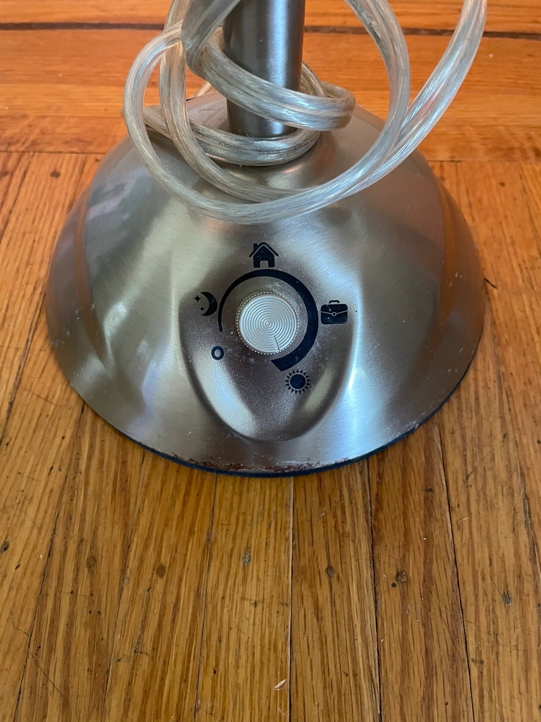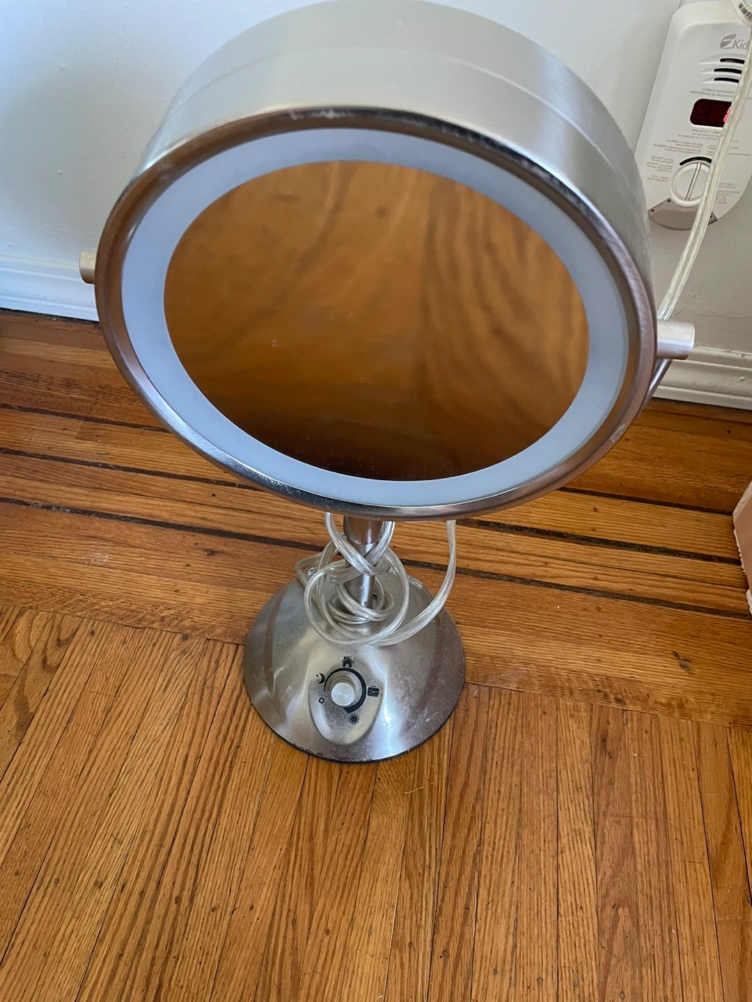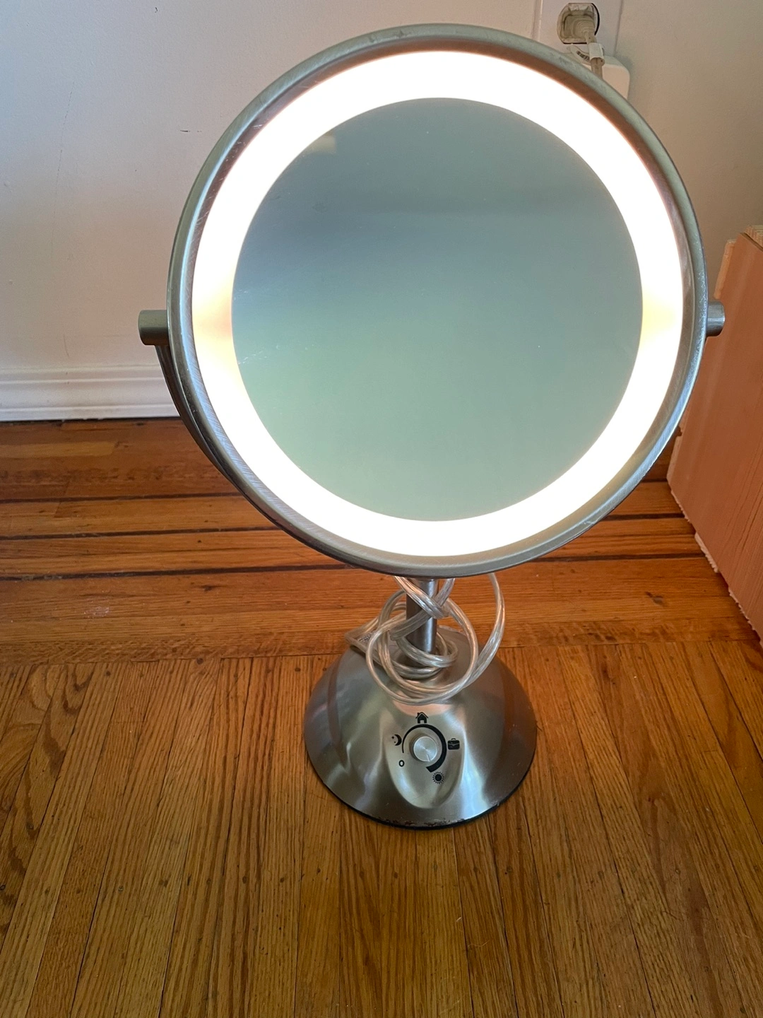 Make up mirror with 2 sides, 1 regular and 1 magnified, light adjusts from cool to warm.