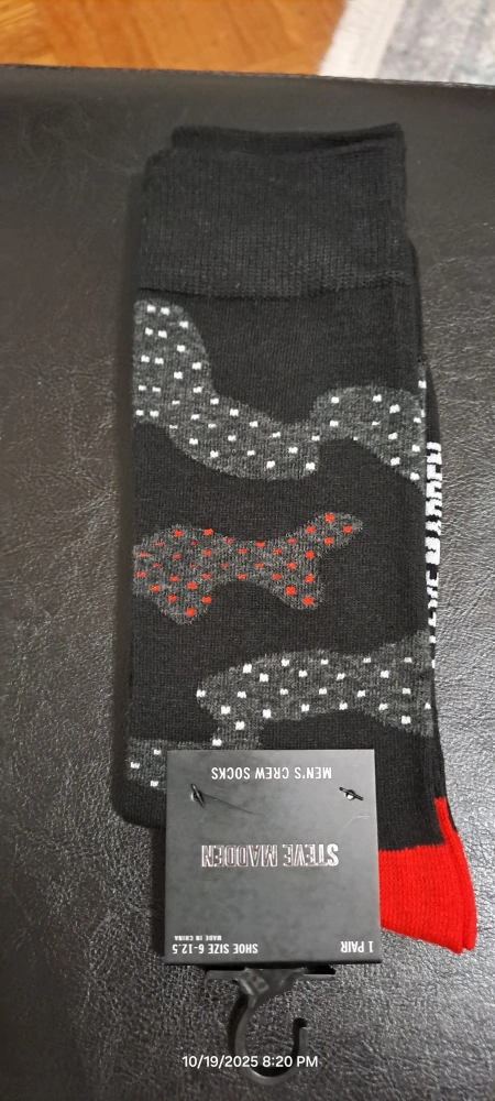 65These are Steve Madden men's crew socks, perfect for everyday wear! They fit shoe sizes 6 to 12.5. The socks feature a stylish pattern and are brand new...have 6 pairs with tags...thanks everyone..sold separately