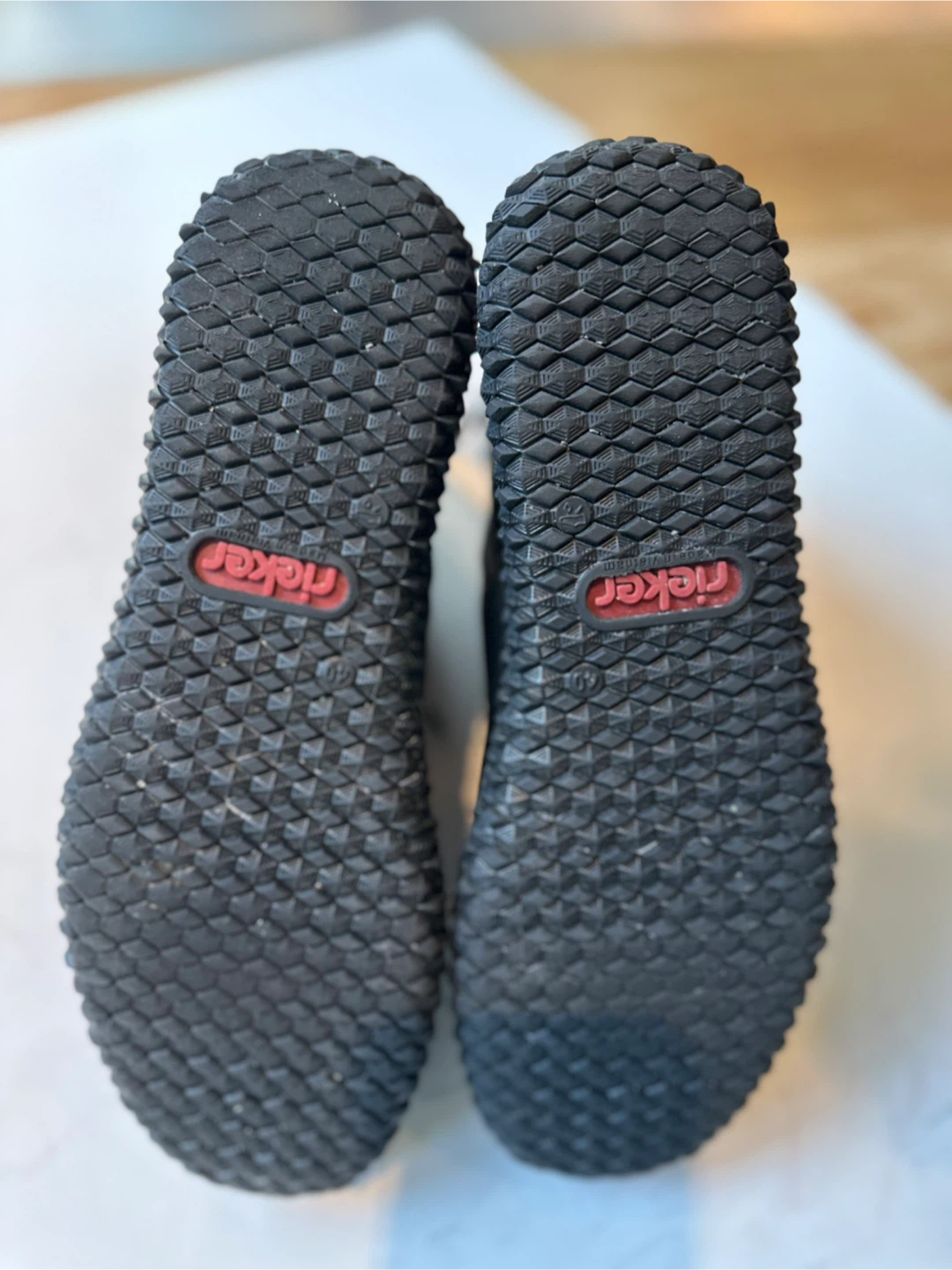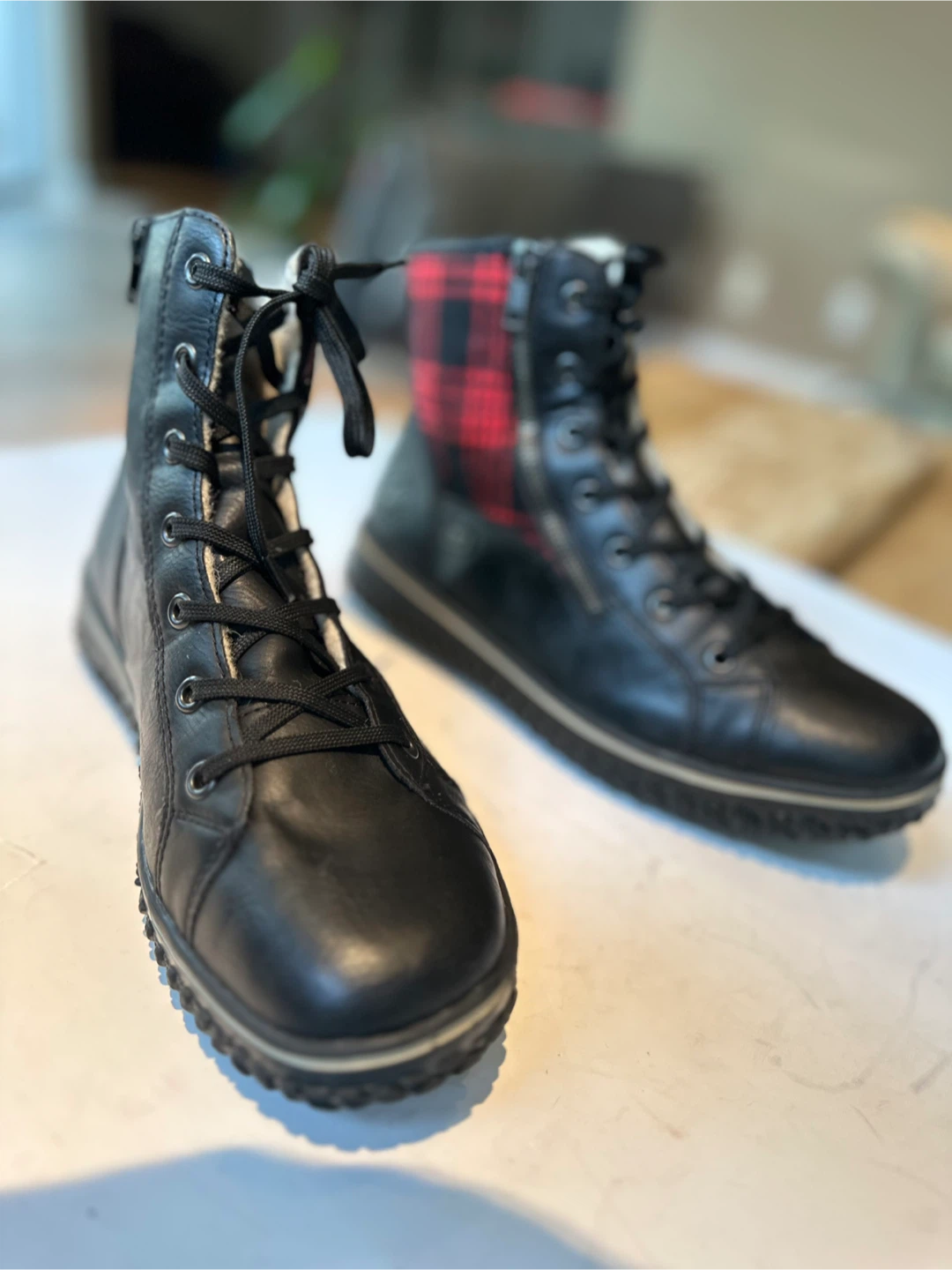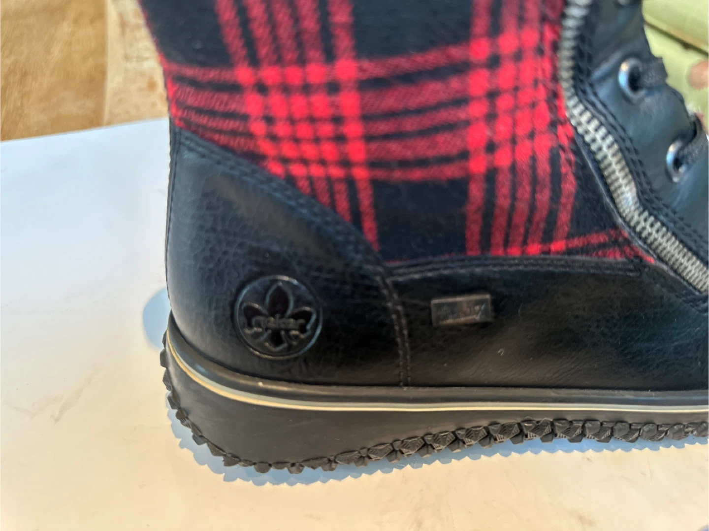 Rieker fleece lined ankle boots in great condition! They're black with a fun red plaid accent and side zipper for easy entry. Durable non-slip rubber soles.