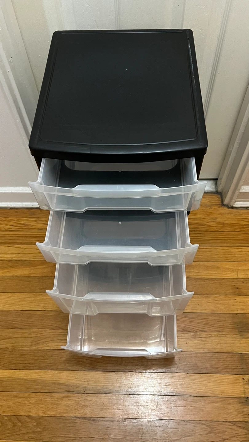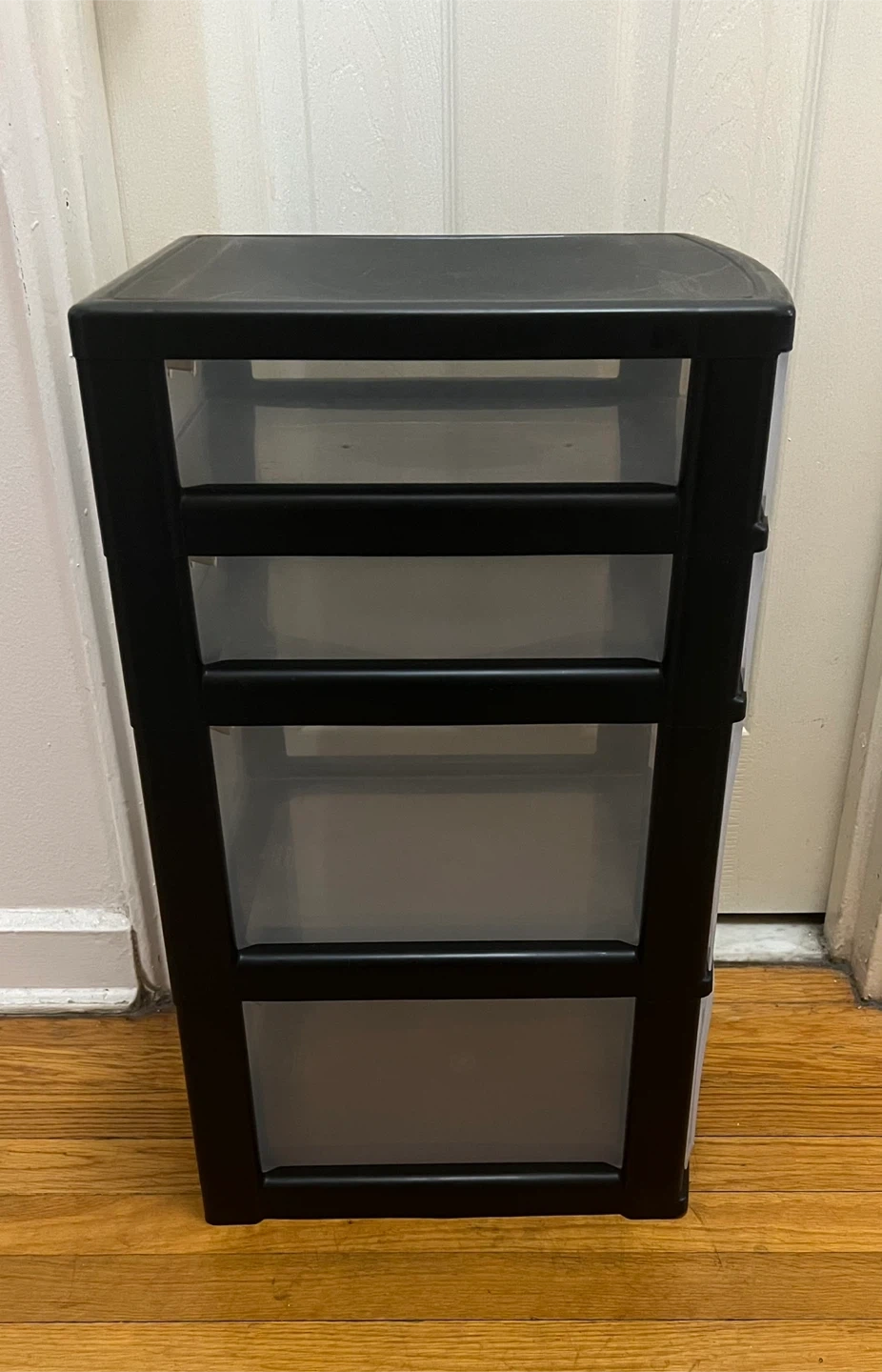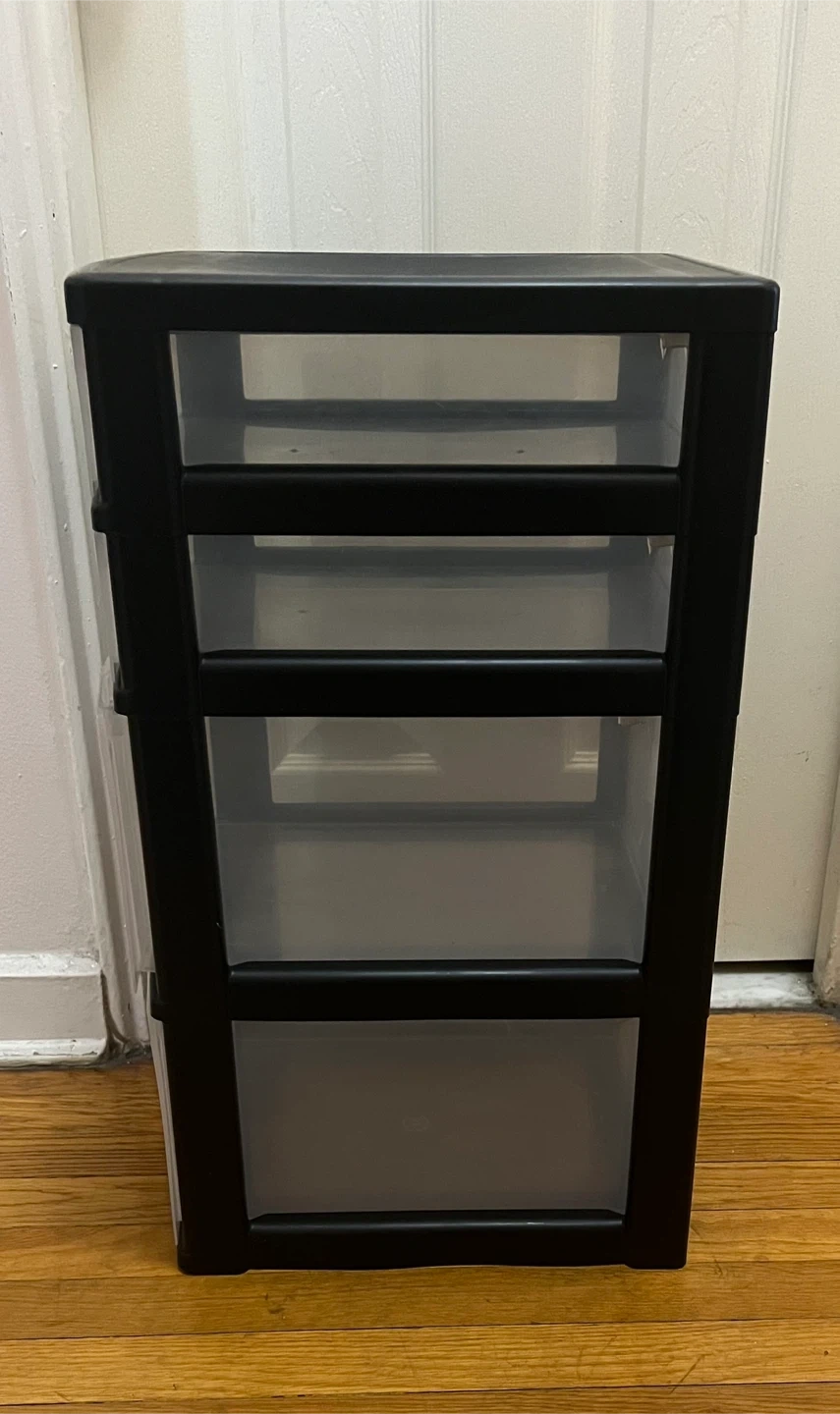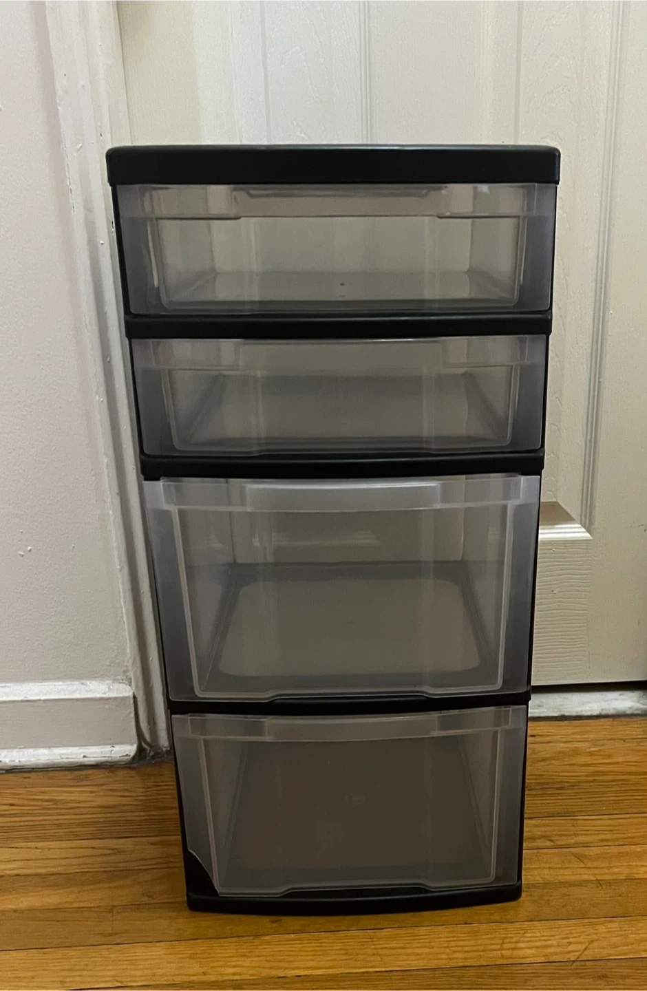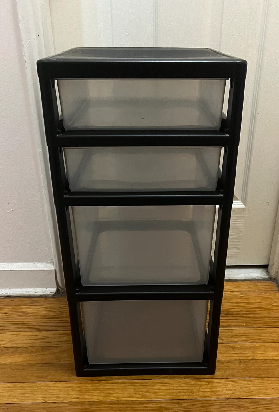 55Used - in good condition. Rearranging my space and no longer need. Perfect storage solution for offices, hobby rooms, dorm rooms, and more. The four clear plastic drawers have easy access handles, and built-in stops to prevent drawers from falling out when opened. The flat top provides a stable surface to keep books, papers, home decor, and other items in easy reach. Top two drawers are 3” deep; bottom two drawers are 7” deep. Dimensions: 12.25” W x 14.25” D x 24.25” H *Bottom drawer has a corner piece broken off (see last photo) but doesn’t impact functionality. **Does not include wheels but they can be purchased separately. Pick up only, near Astoria Park - Queens NYC 11102 Only Cash (preferred) or Venmo for payment Check out my other listings!