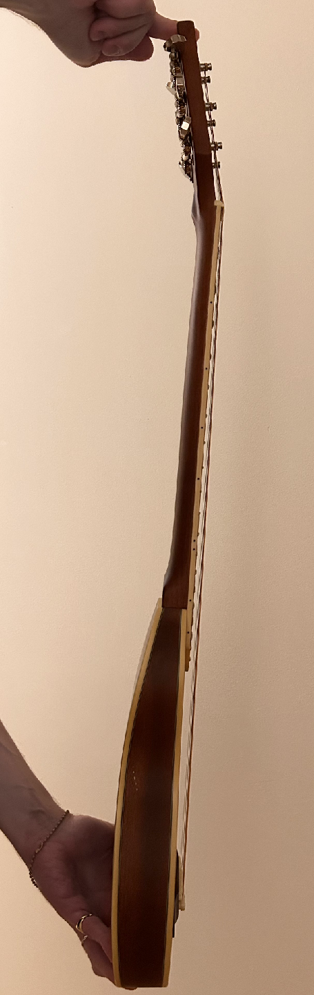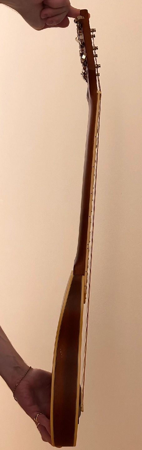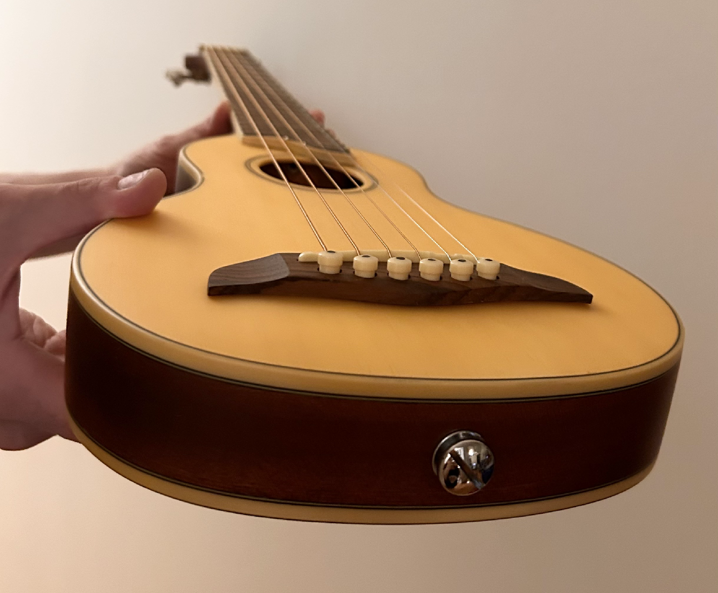 The guitar has been used (by me) but in now way abused, and is ready to (tune and) play. It's in great condition and perfect for taking on trips or practicing in small spaces. The Rover series is known for its portability and surprisingly good sound for its size. Great for beginners or experienced players who need a compact instrument.