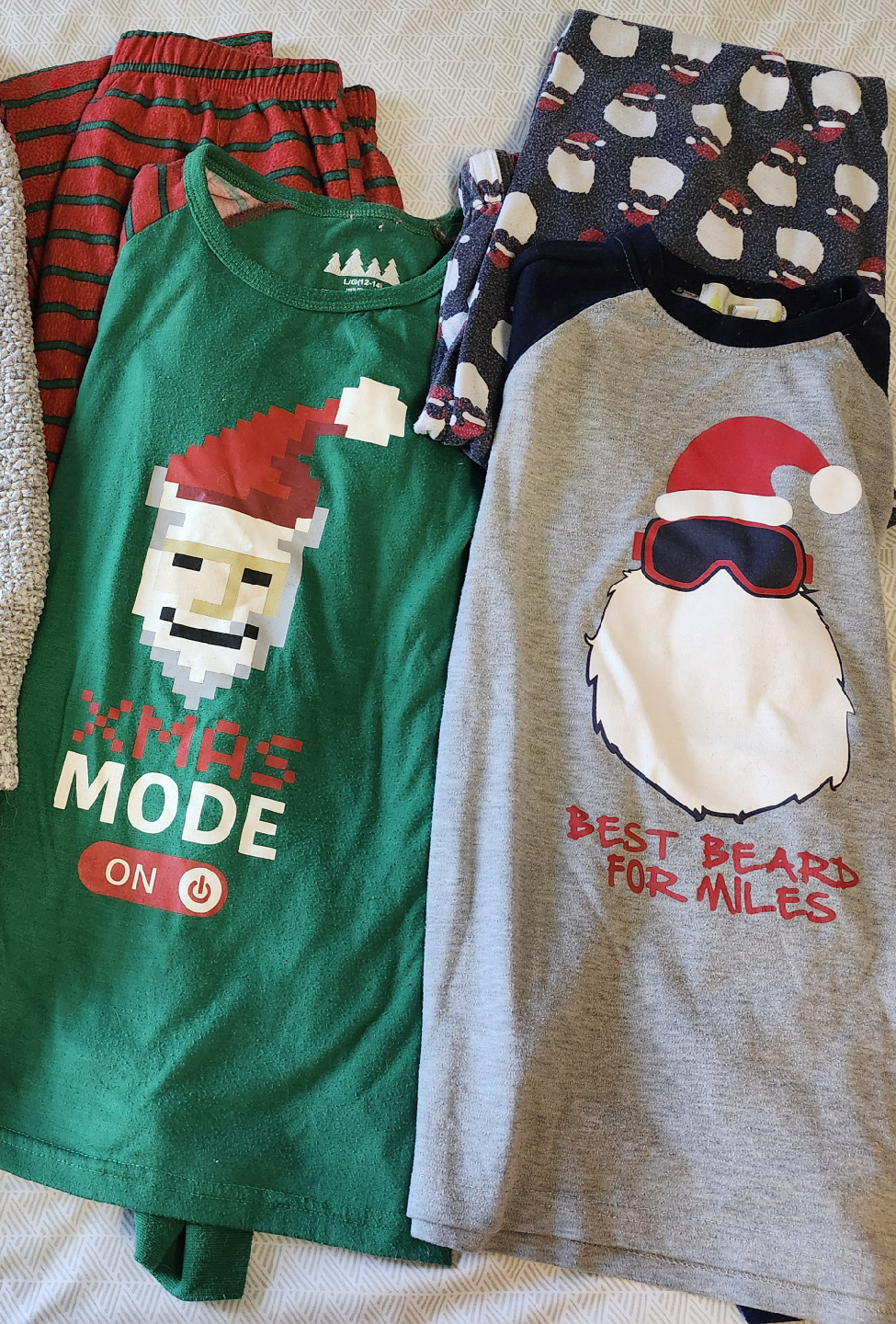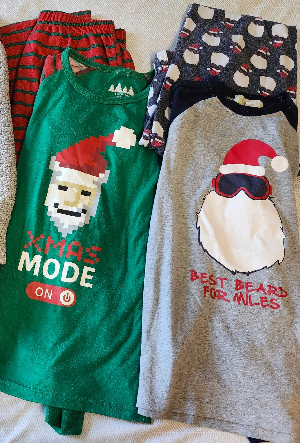 2 pairs of holiday pjs that fit kids size 10/12. Both for $8