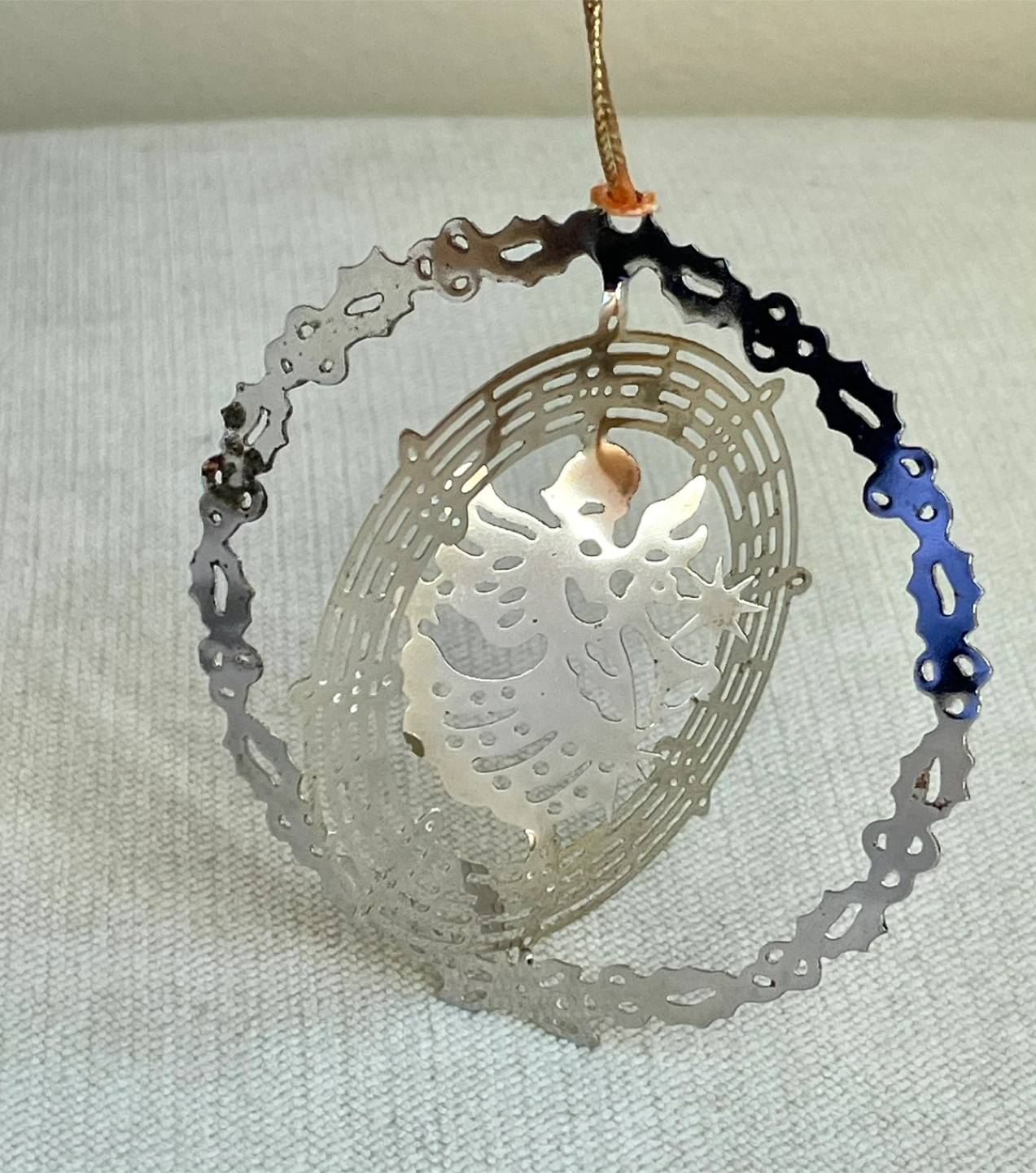 Three adjustable concentric ring sections give this ornament its beautiful 3D appearance. The angel is in the center section, a musical score is the middle ring, and the outer ring is holly branches.