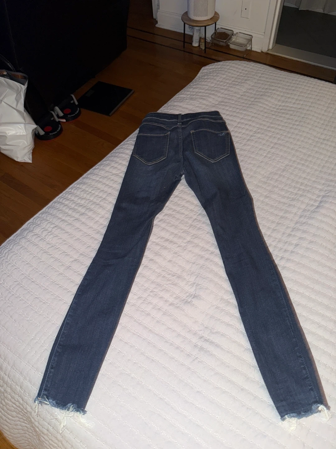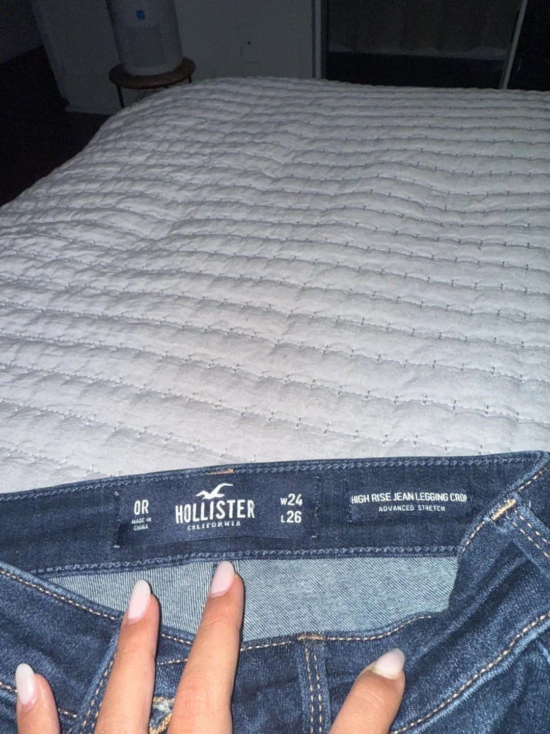 Selling a pair of Hollister high rise jeans legging crop in size W24 L26. They are a dark wash denim with some distressed detailing. Perfect for a casual look!