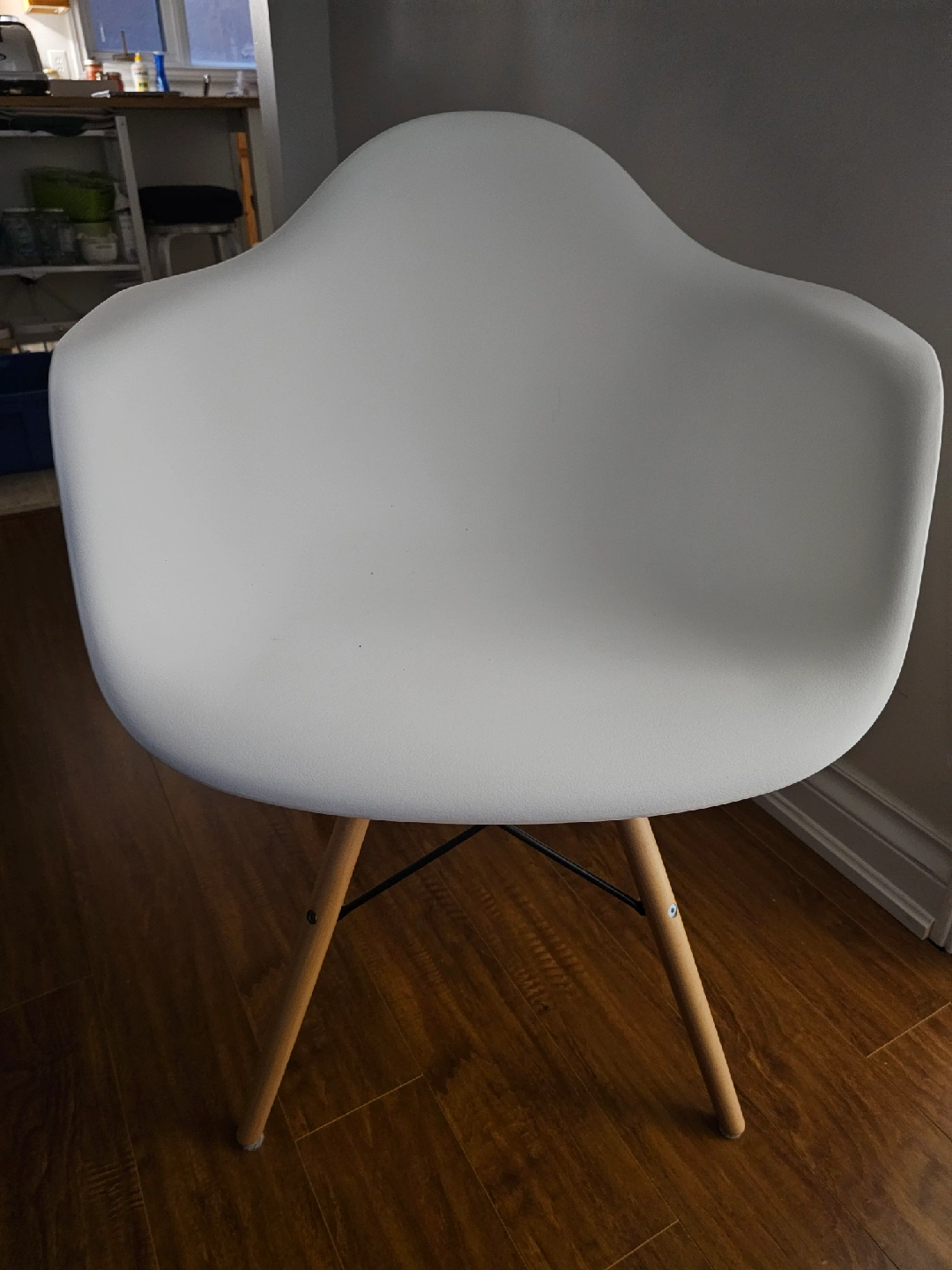 10We are offering for sale a set of four white Eames-style armchairs. These chairs are in excellent condition and are suitable for various interior settings. The design features wooden legs and a comfortable molded plastic seat.