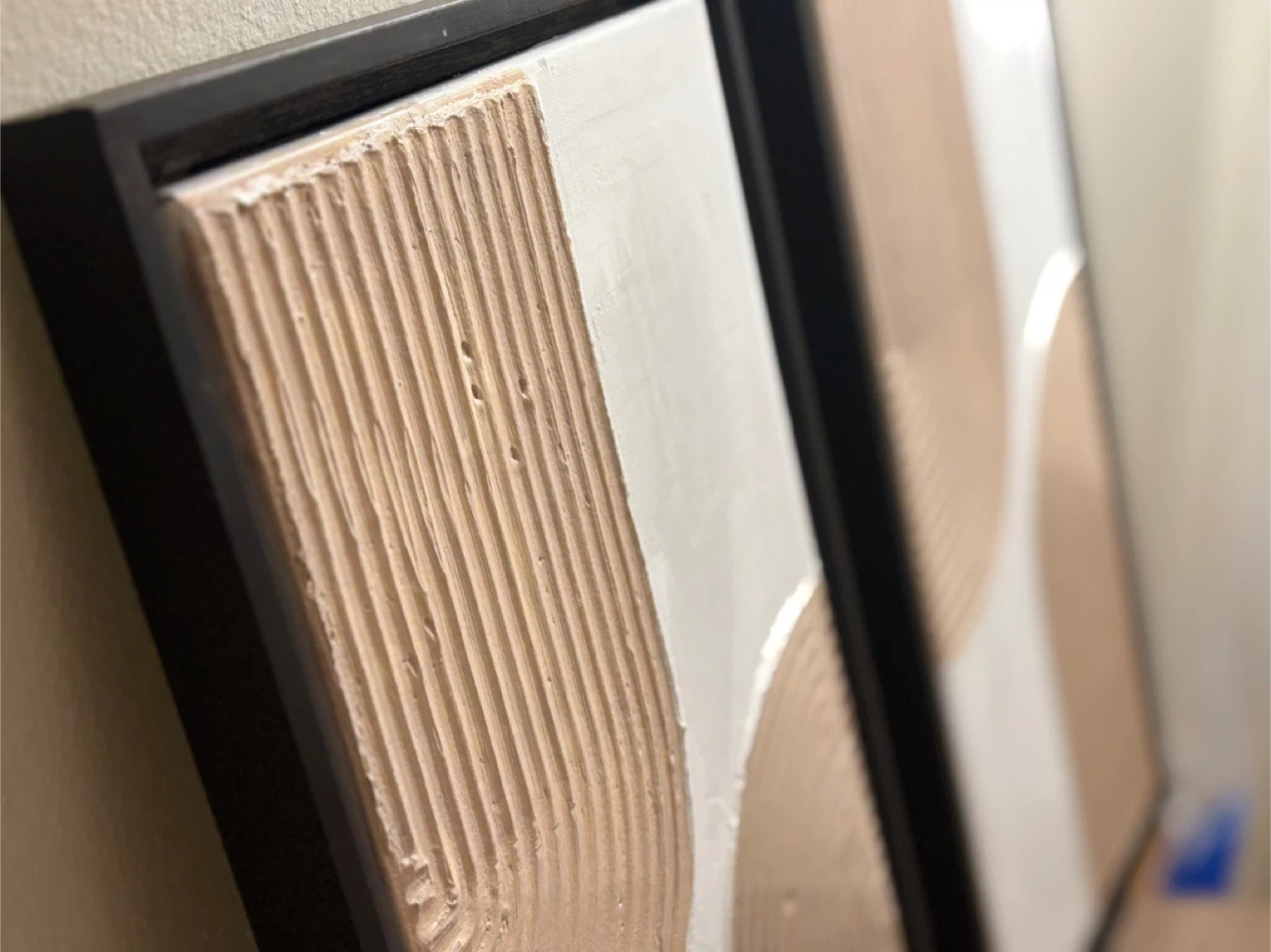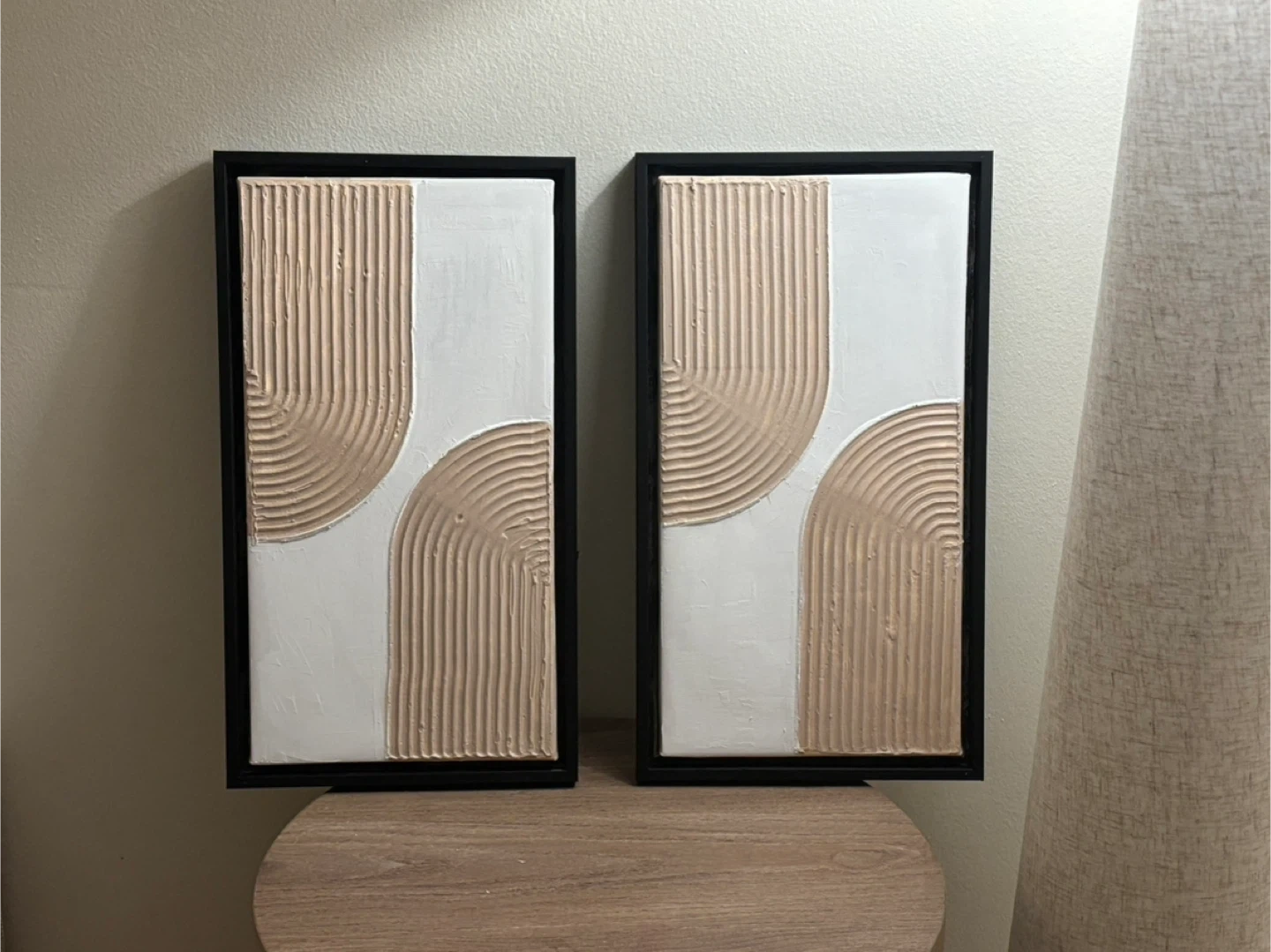 I'm selling a set of two textured abstract wall art pieces. They have a modern design with a neutral colour palette that would complement any room. The pieces are framed in black and are in great condition. They're perfect for adding a touch of sophistication to your home decor