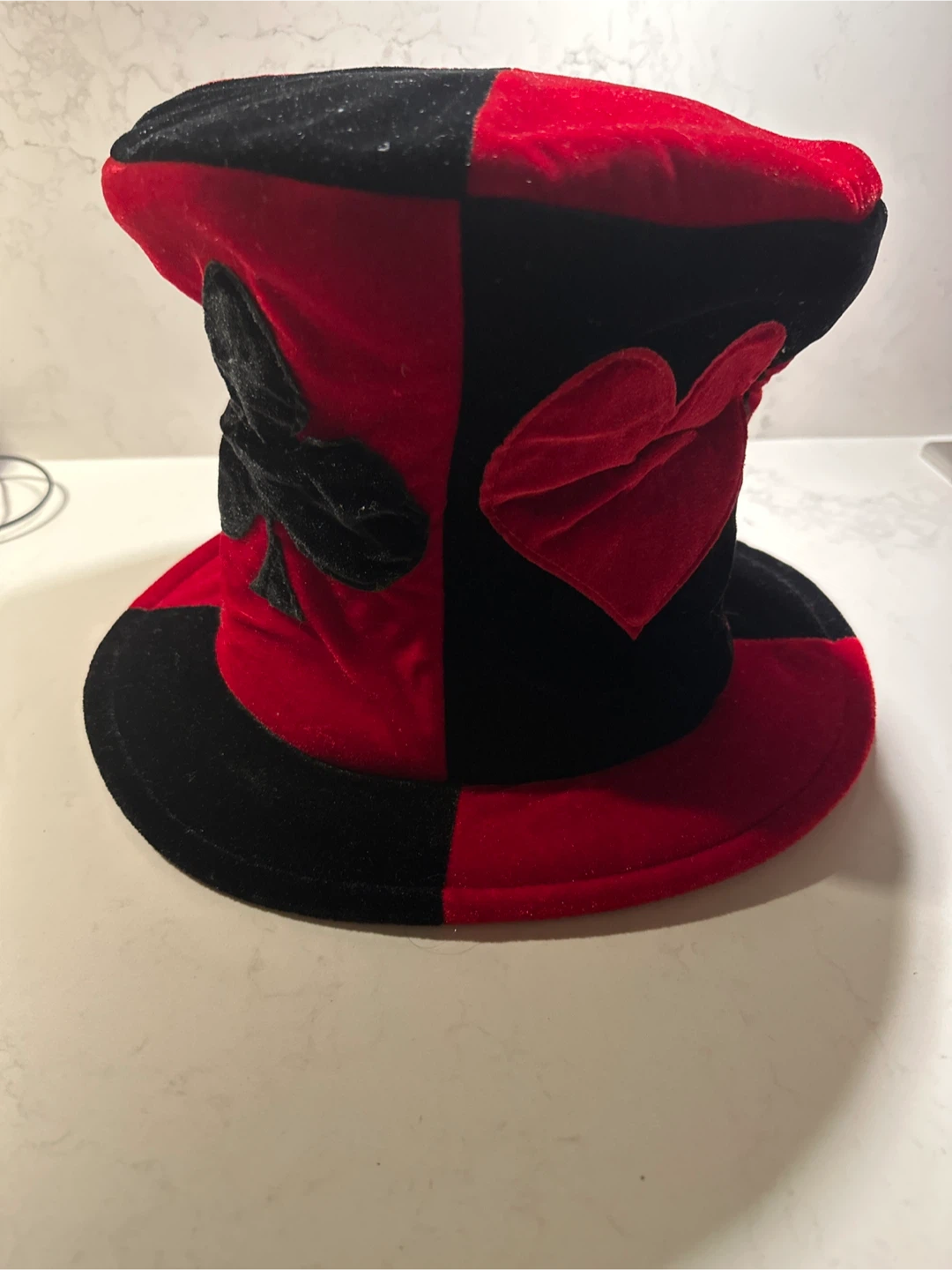 I have a fun Mad Hatter style hat for sale! It's a red and black velvet-like material with playing card suit symbols. Great for costumes or parties