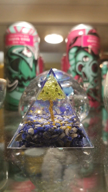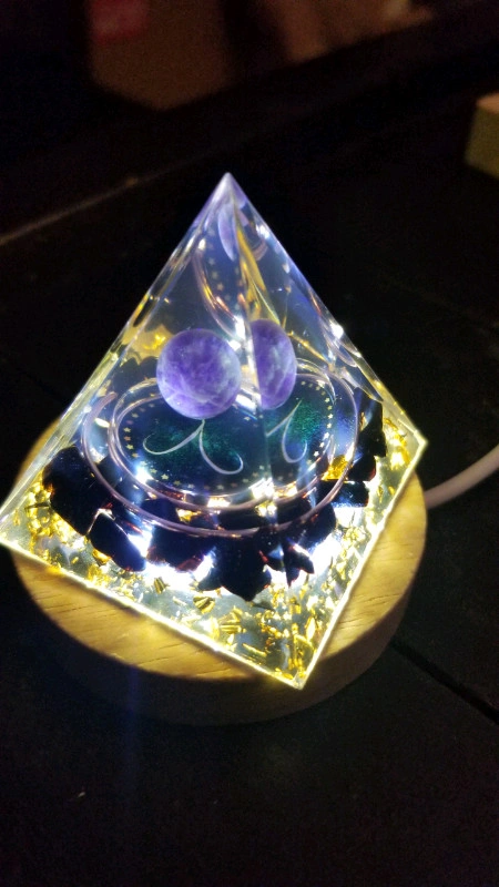 15I have two different ones available. Choose which style you like best, or get both for $40. The wood base has a bright multicolour LED light that gradually cycles between different colours. It plugs in to USB and has an on/off power switch. Makes a great gift and/or paper weight. :) Looks good with or without the lighted stand. Here's a short clip of the light changing colour: https://youtube.com/shorts/yzqGngt58r4?feature=share Price is for one with the Multi-coloured lighted stand. Without lighted stand, I can do $15 for one. With lighted stand and both pyramids, $40.