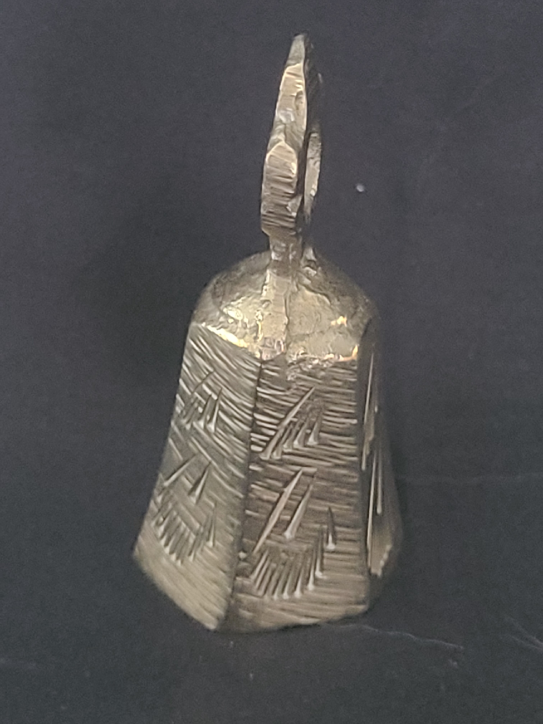 Selling a vintage brass hand bell! It has some really nice detailing on the outside. It's in good condition and would be a lovely addition to any collection.