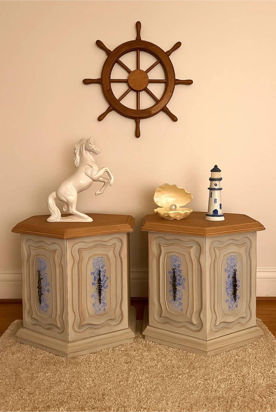 Selling a pair of charming vintage French Provincial nightstands! They feature a unique design with a light blue and wood finish, adorned with delicate blue floral patterns. Perfect for adding a touch of rustic elegance to your bedroom