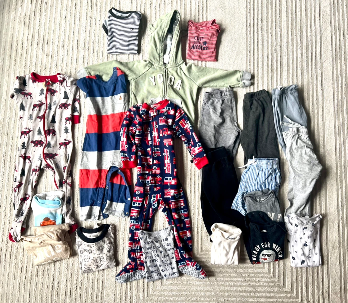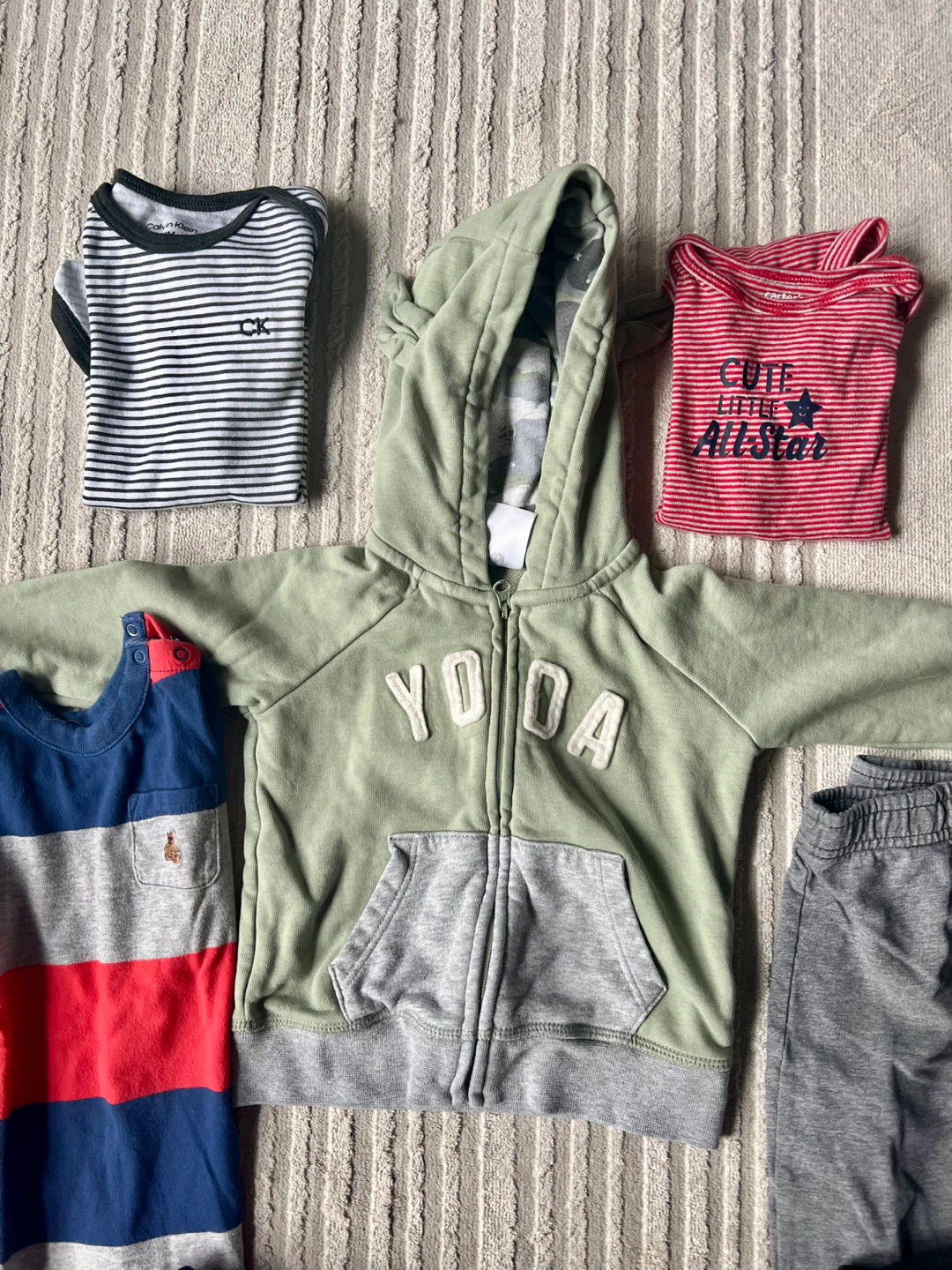 A bundle of baby clothes in sizes ranging from 12-24 months. Includes brands like Old Navy, Carter's, and Gap. A mix of onesies, pants, sleepers and a Yoda hoodie!