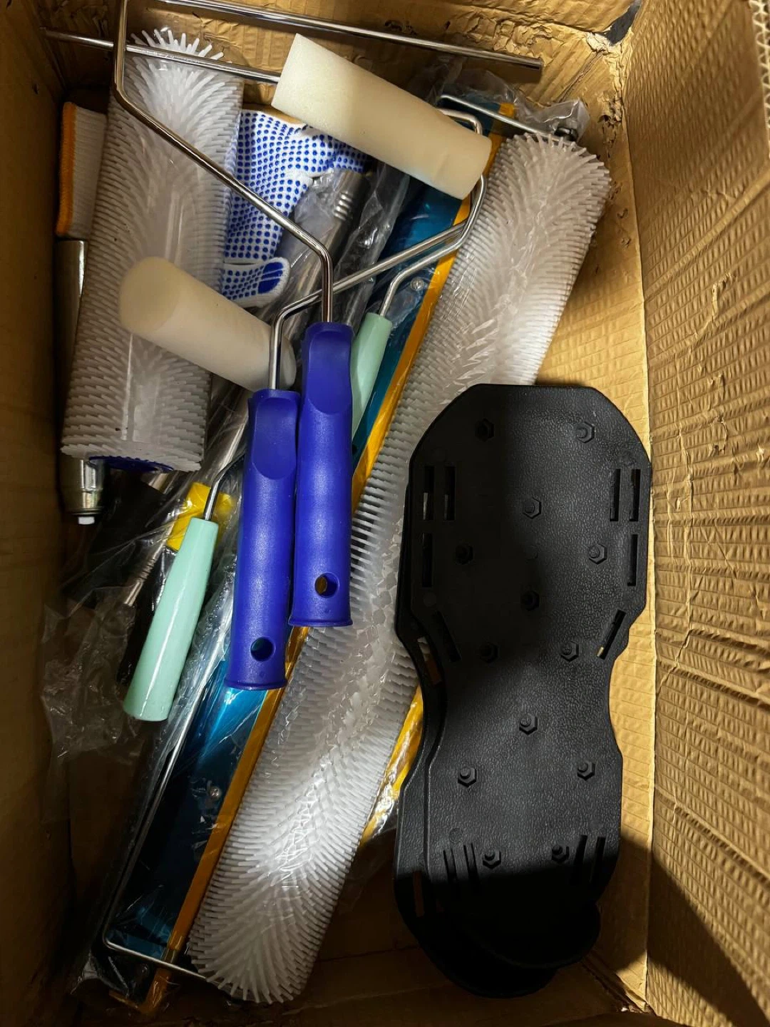 Includes rollers, spike shoes, handle, extension poles, gloves, and more β slightly larger set than the one shown in the first photo.