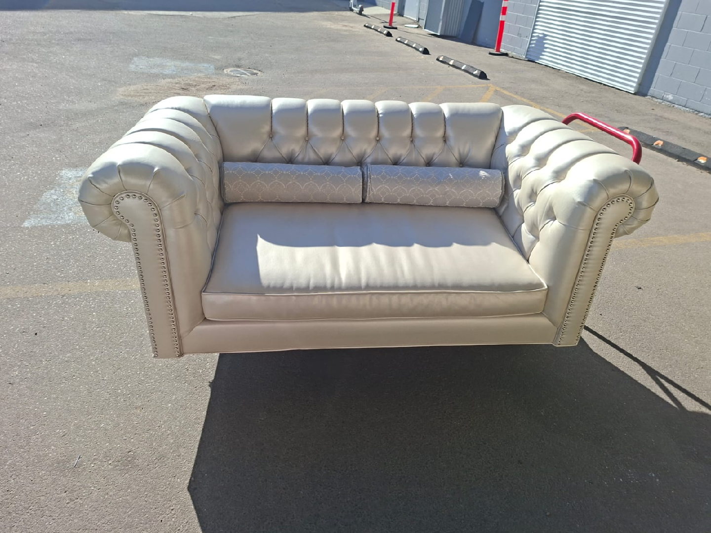 Elegant chesterfield style sofa in a cream colour. Perfect for adding a touch of sophistication to your living room or den. It's in great condition and ready for a new home!