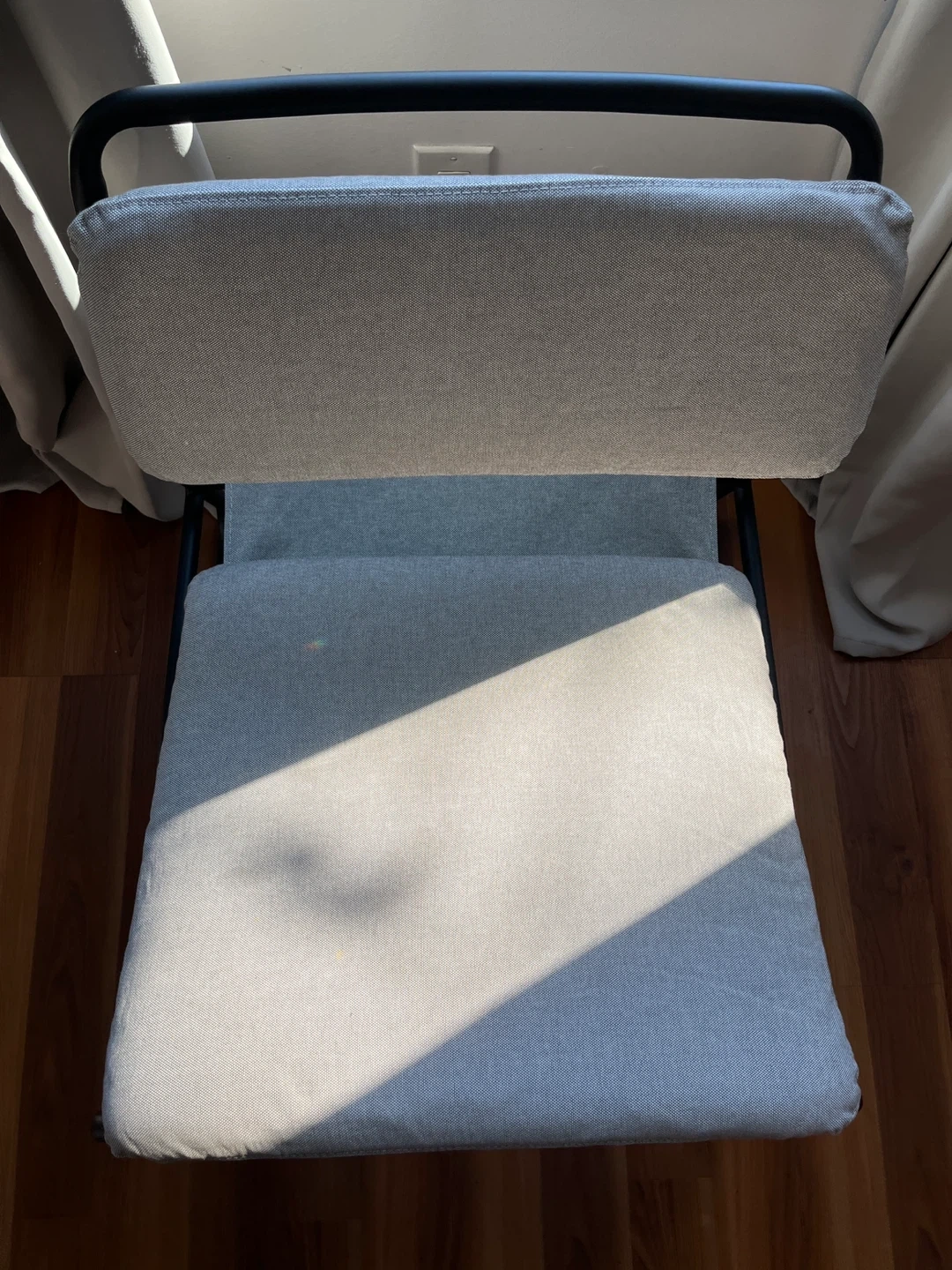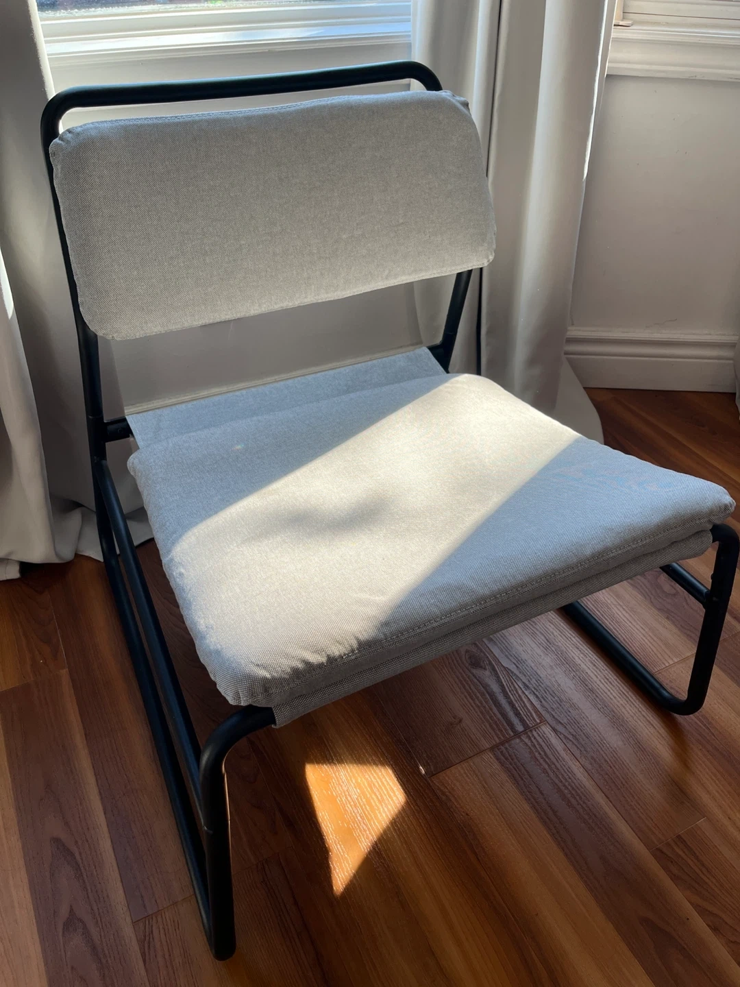 Light grey fabric seat and backrest with a black metal frame.
