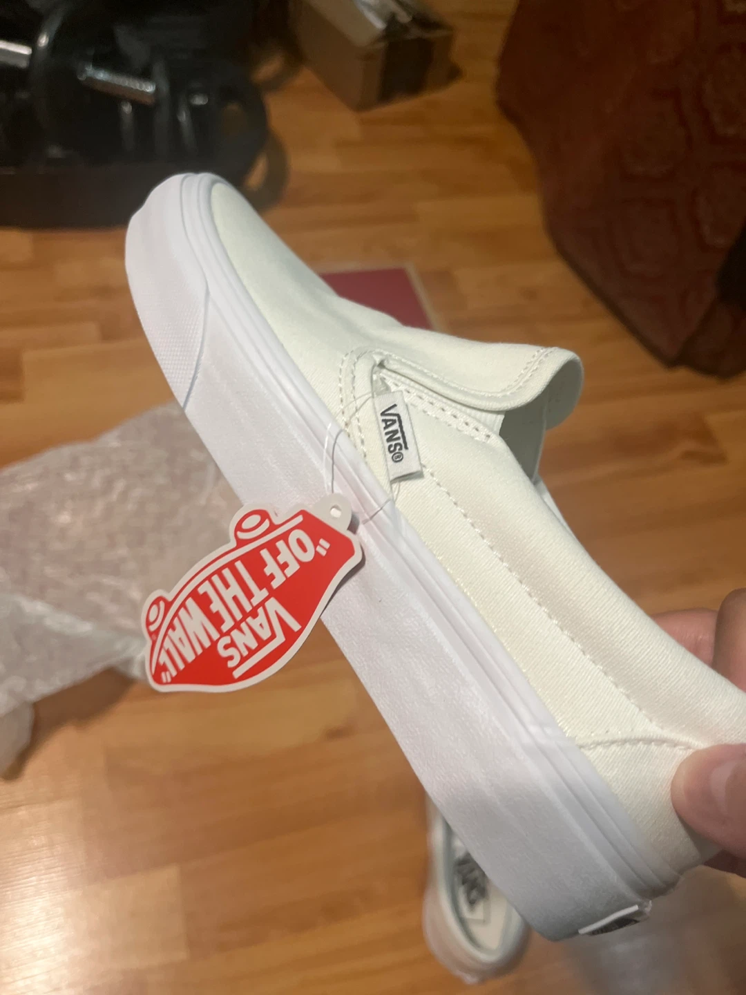 Selling a pair of brand new Vans Classic Slip-On sneakers in women's size 6.5 (US). They are a clean, versatile white colour and come with the original box and tag. Perfect for everyday wear!