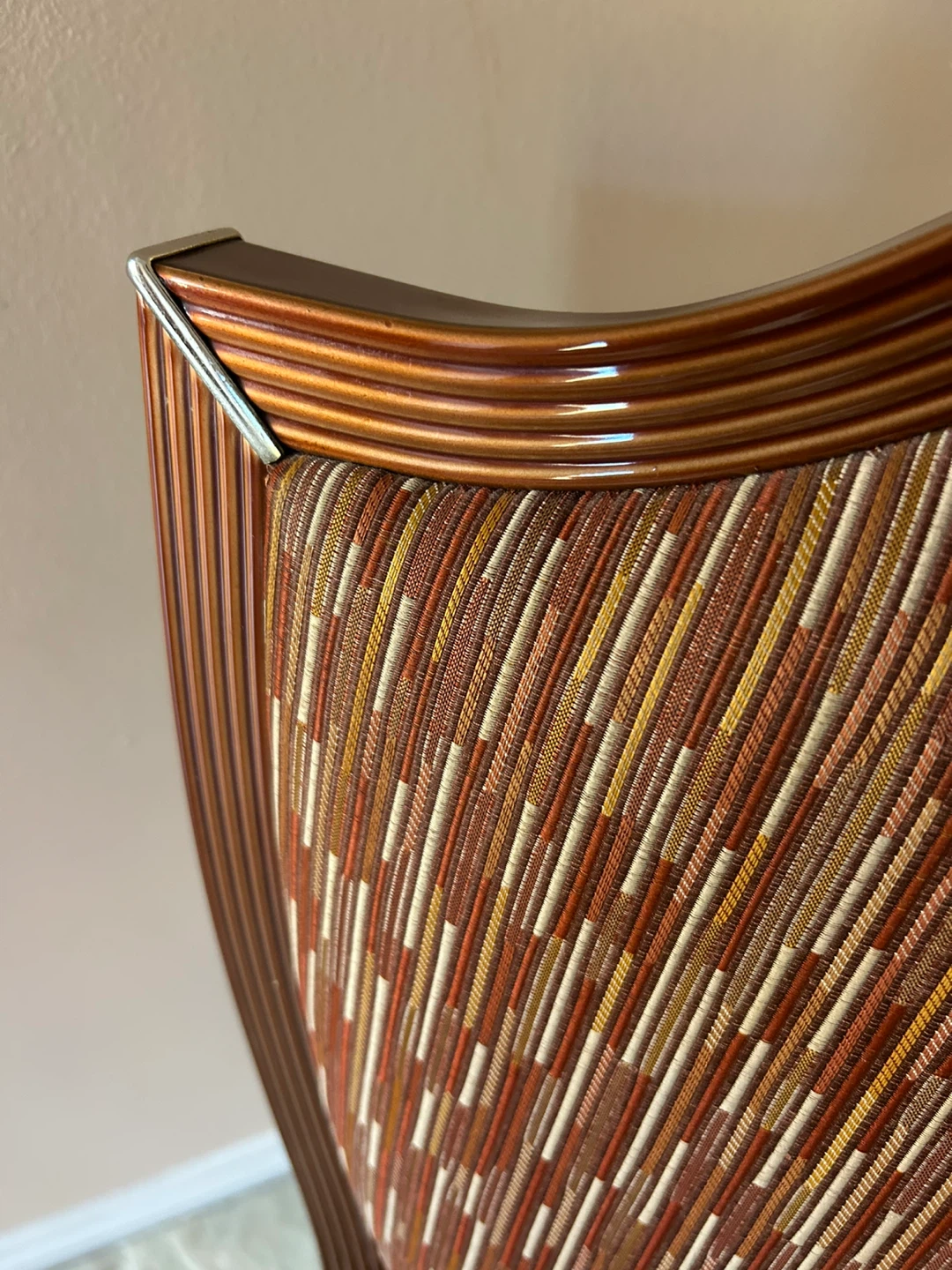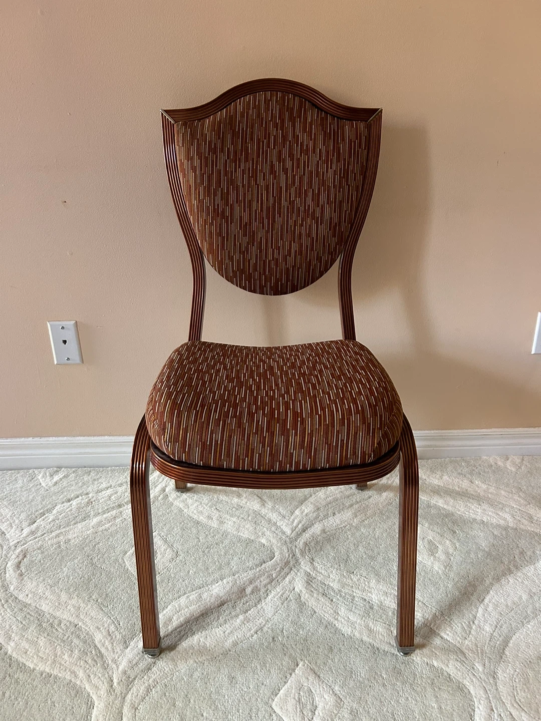 Here's a dining chair with a unique brown patterned upholstery. The frame is a matching brown color and features a decorative design. It's a great addition to any dining space!