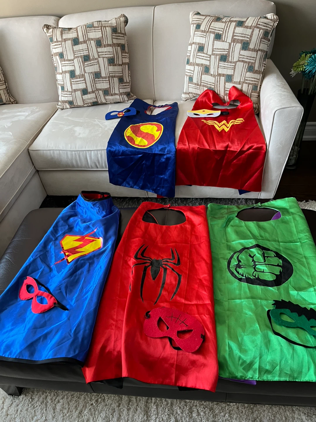 Selling a set of superhero capes and masks! Includes Superman, Wonder Woman, Spiderman, and Hulk. Perfect for dress-up and imaginative play for your little ones!