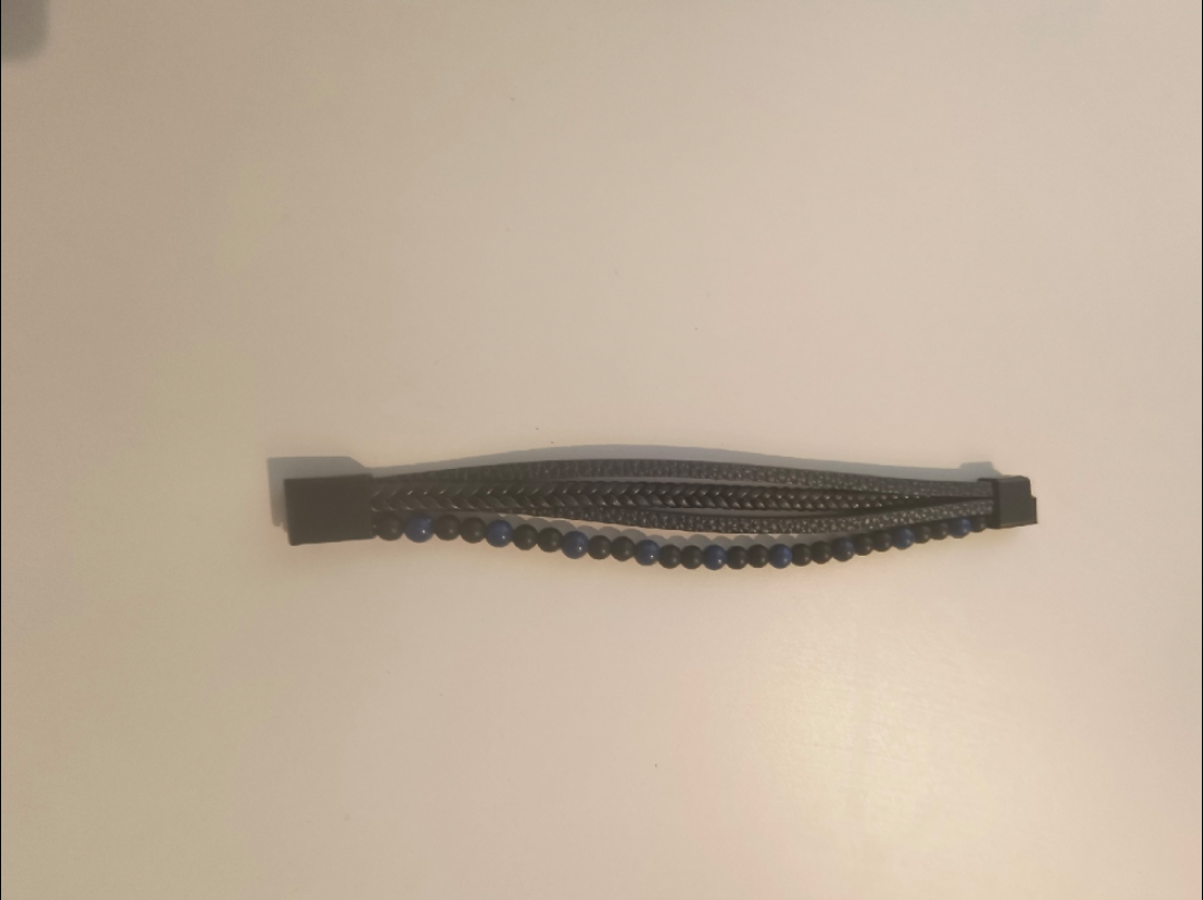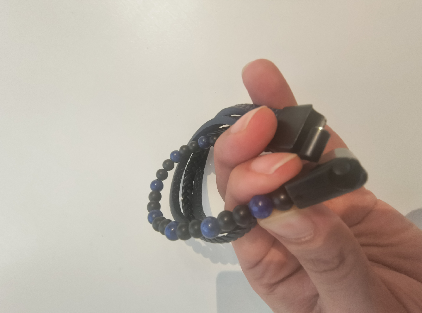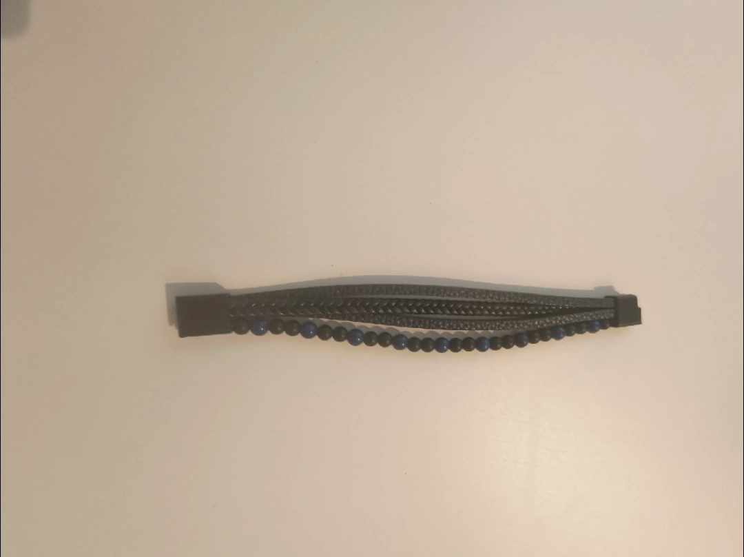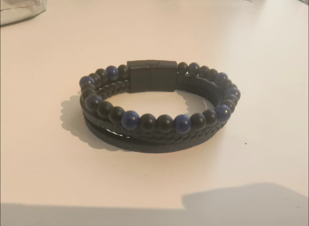 Selling a stylish men's bracelet featuring a combination of black braided leather and blue/black beads. It's ready to add a touch of sophistication to your wrist!