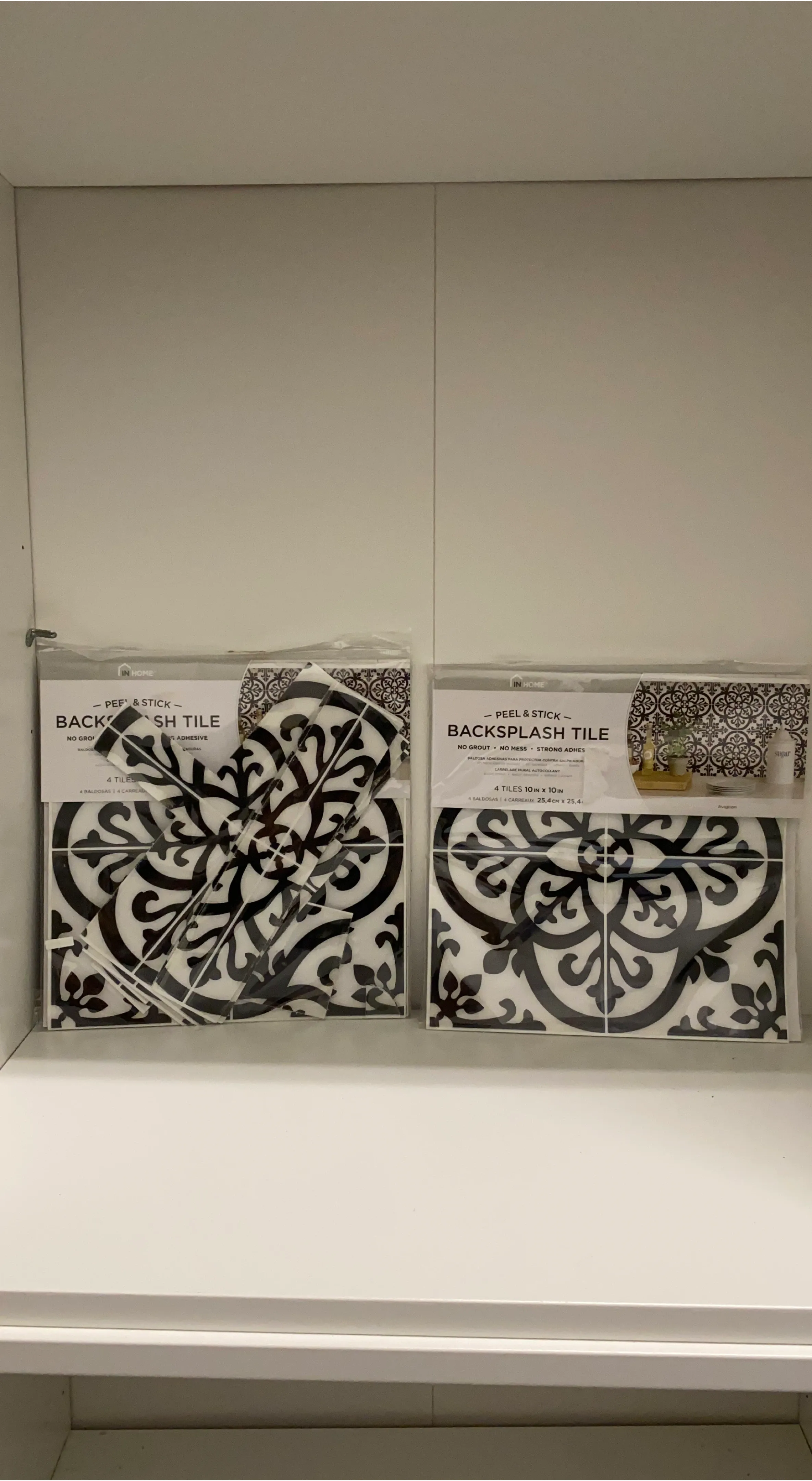 Selling two packages of In Home peel and stick backsplash tiles. Each package contains 4 tiles, and each tile measures 10 inches by 10 inches. These are super easy to install - no grout or mess needed!
