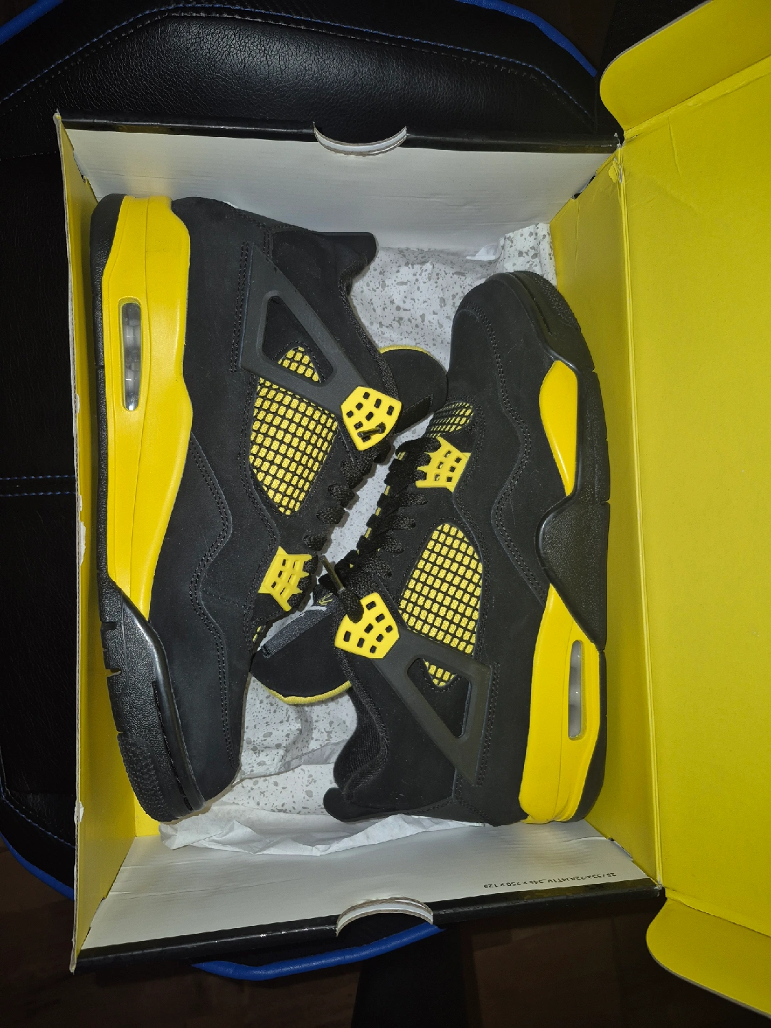 Selling a pair of Air Jordan 4 Retro 'Thunder' sneakers in black and yellow. They come with the original box. These are a stylish and iconic addition to any sneaker collection! open to trades