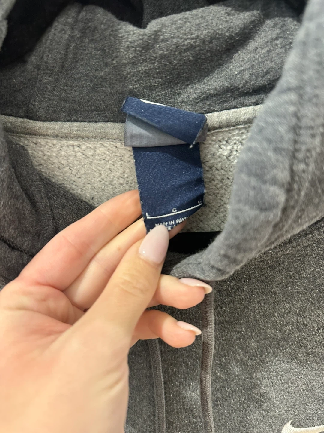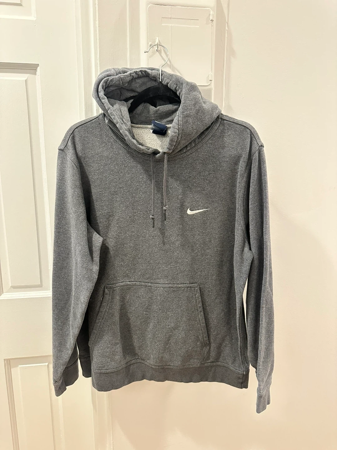 73Selling a gray Nike hoodie in size large! It's in good condition and has the classic Nike swoosh logo. Perfect for staying cozy or layering up