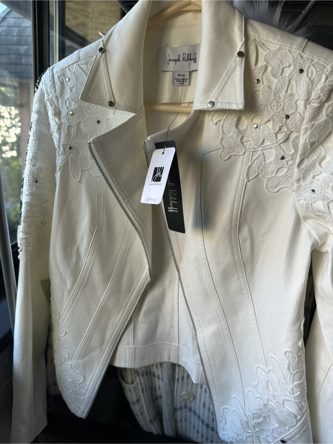 Selling a beautiful Joseph Ribkoff jacket in cream. It's a size XS/TP and features lovely floral detailing and silver studs. Perfect for adding a touch of elegance to any outfit!