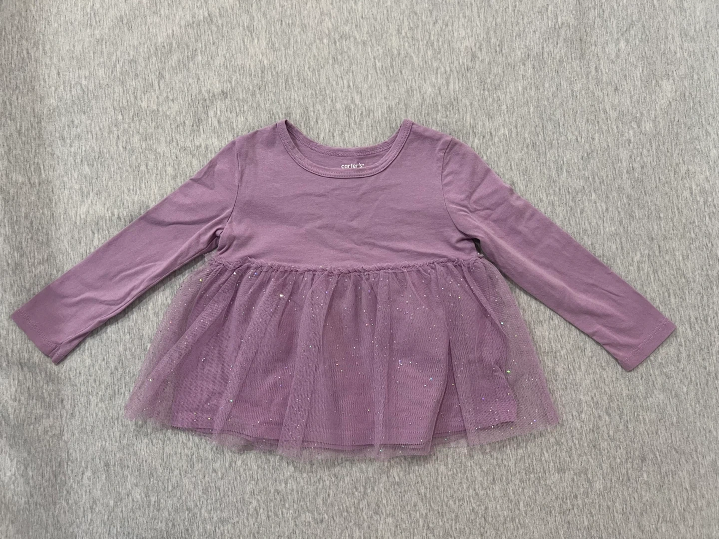 A cute purple long-sleeve top from Carter's featuring a tulle skirt with subtle sparkles. A barely noticeable stain spot in the front (as shown in the photo)