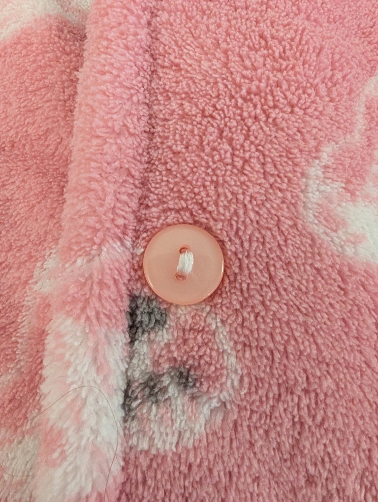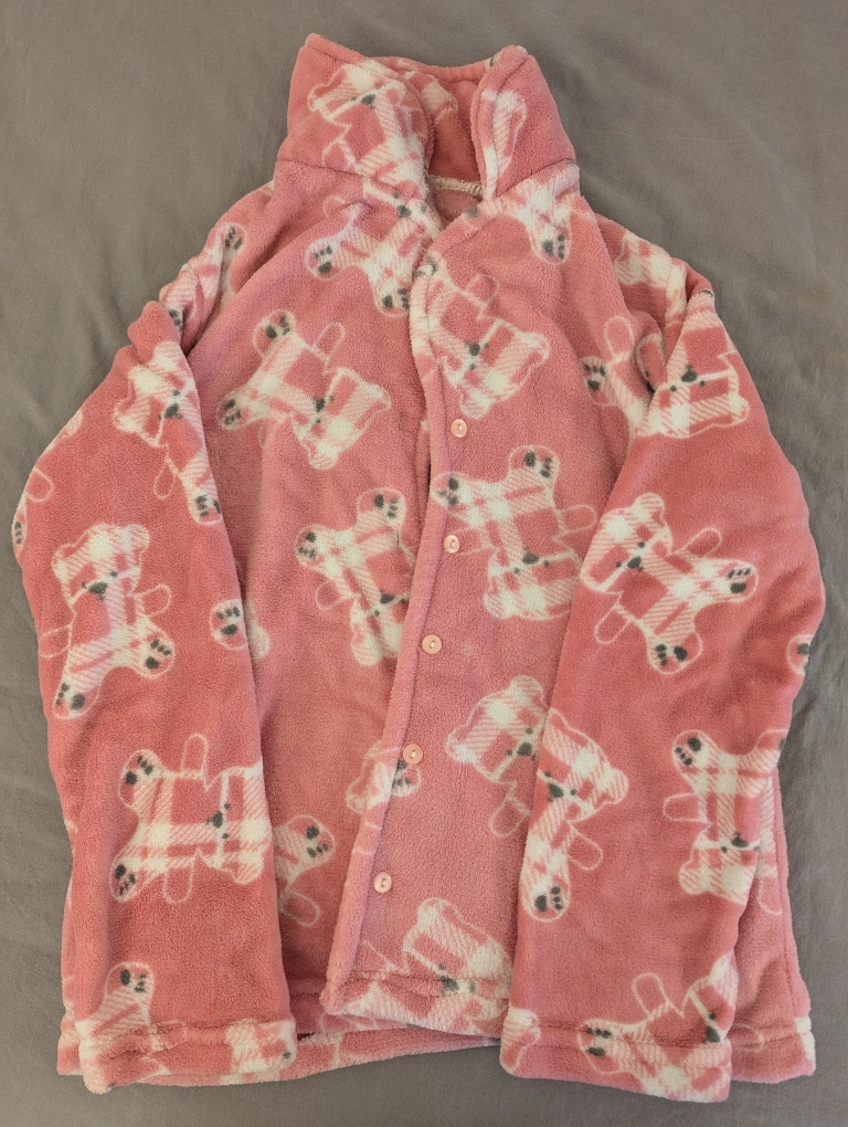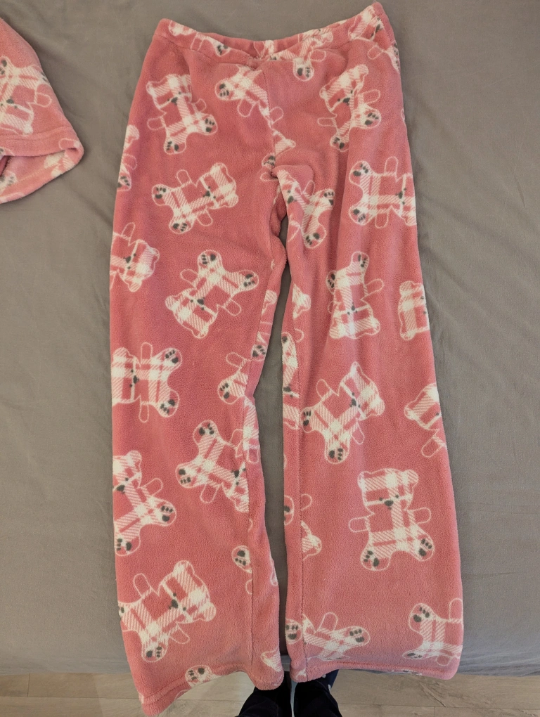 140Cozy up in this adorable pink pajama set! It features a cute teddy bear pattern all over, making it perfect for a comfy night in. The set includes a button-up top and matching pants, both made of a soft, fuzzy material. Size: Small (10-12 years)