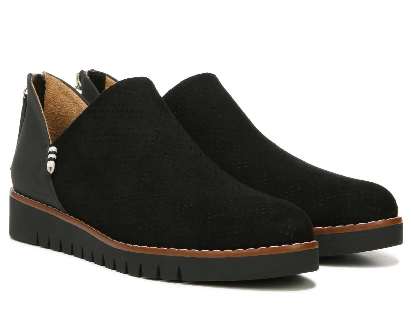 These black platform loafers from Dr. Scholl's are a stylish and comfortable choice! They feature a unique perforated design and a sturdy platform sole. Perfect for adding a little height and a lot of style to your everyday look