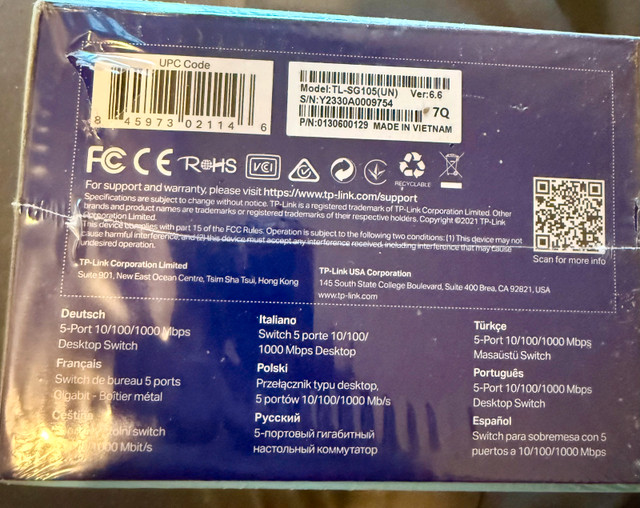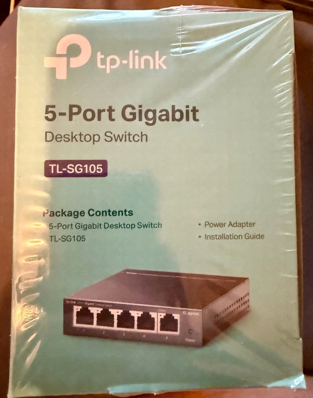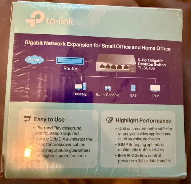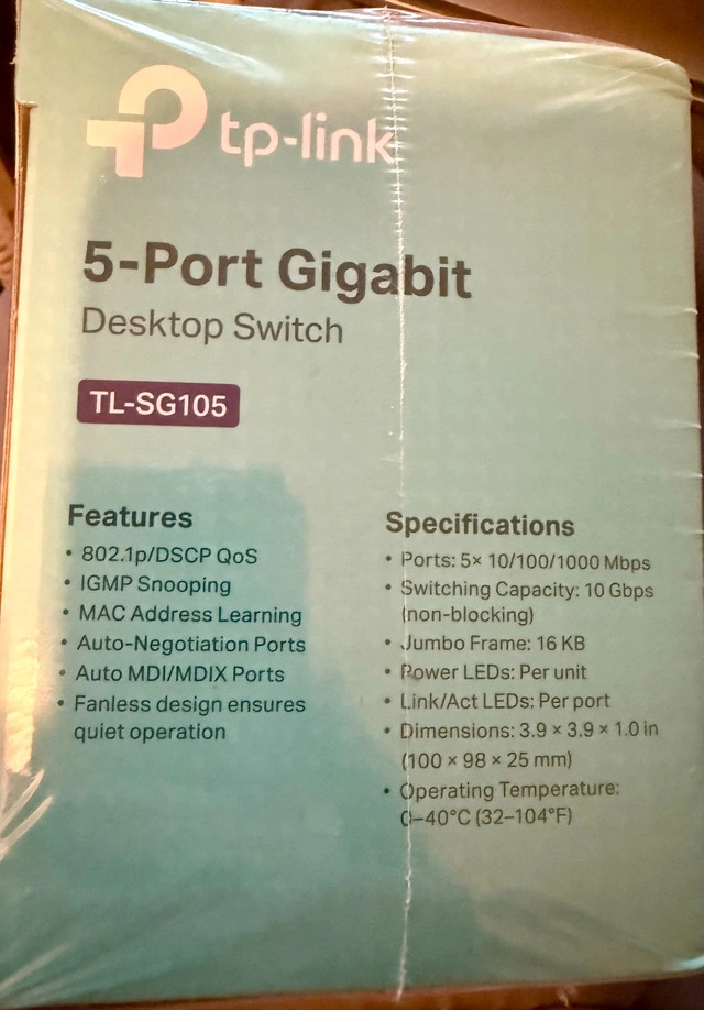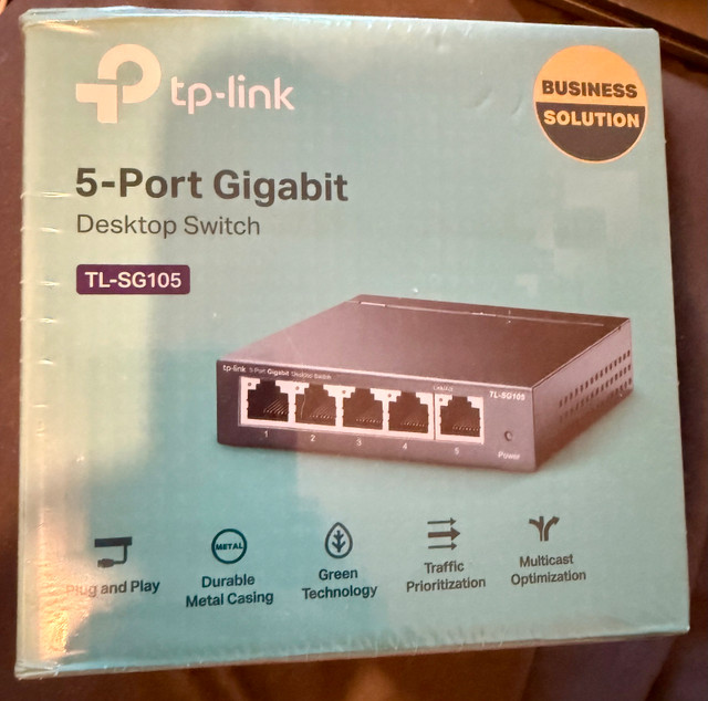 New TP-Link TL-SG105 5-Port Gigabit Desktop Switch with 5 x 10/100/1000 Mbps ports. Ideal for small office or home use, this switch features a durable metal casing and plug-and-play setup. Key features include 802.1p/DSCP QoS and IGMP Snooping. The fanless design ensures quiet operation. It also supports auto-negotiation and auto MDI/MDIX ports.