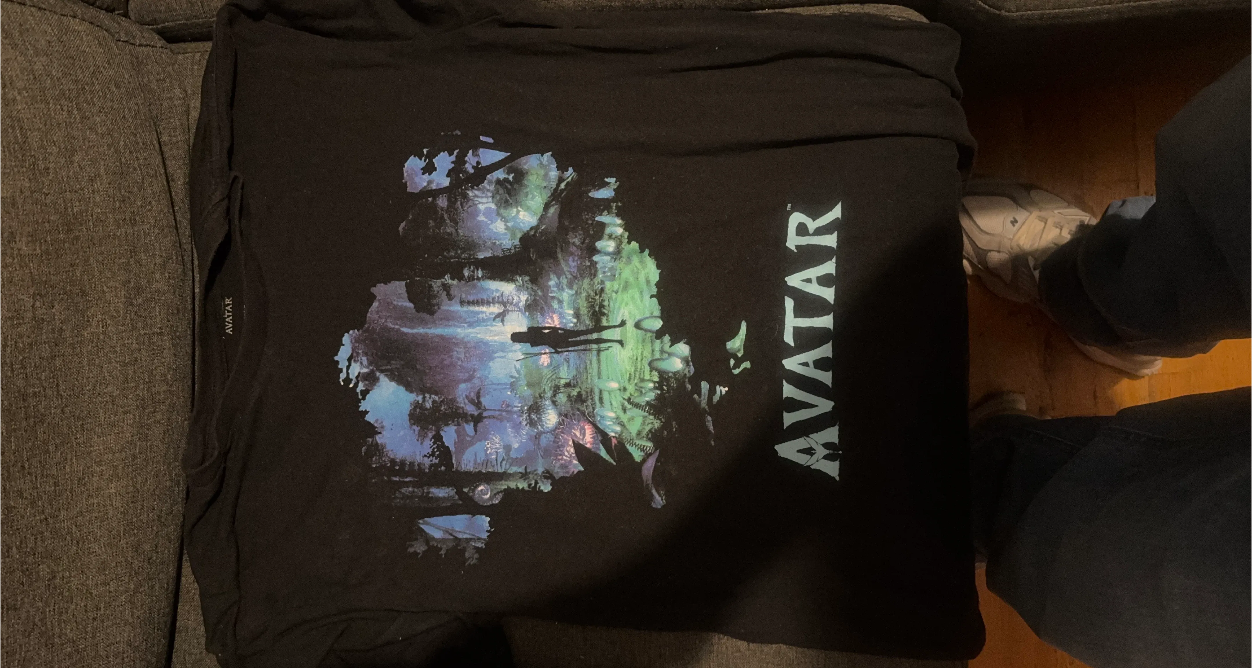 Selling a black t-shirt with a graphic from the movie Avatar. The shirt features a scene from Pandora and the Avatar logo. It's in great condition!